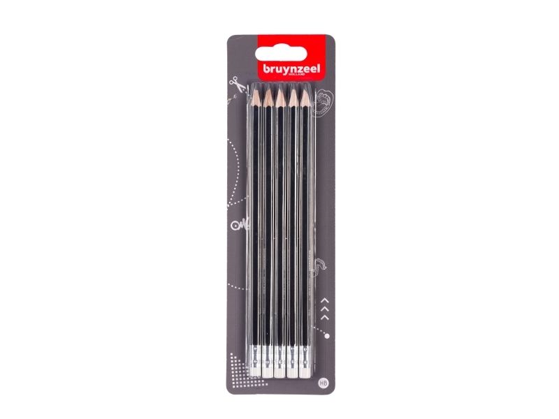5 HB graphite pencils of the renowned Bruynzeel quality, with an eraser on top. Specially created for schools. Extra strong, thanks to a thick core and the complete adhesion of the core to the wood. <