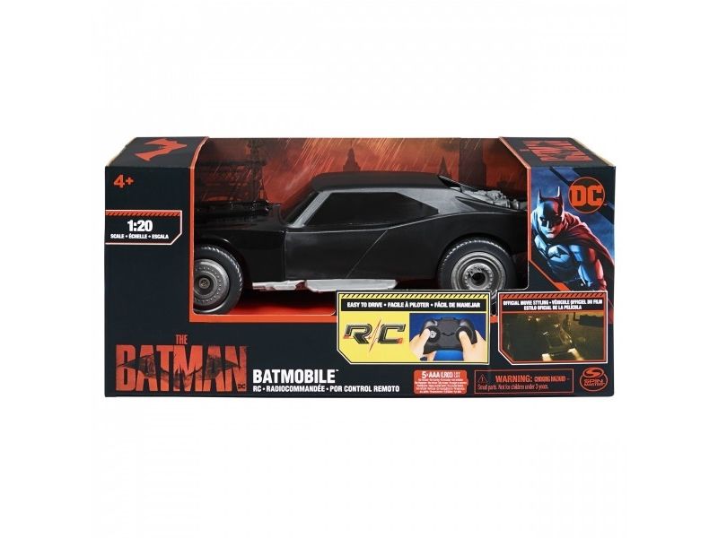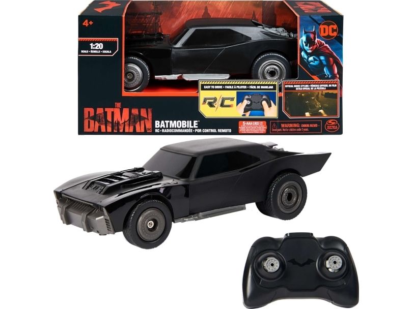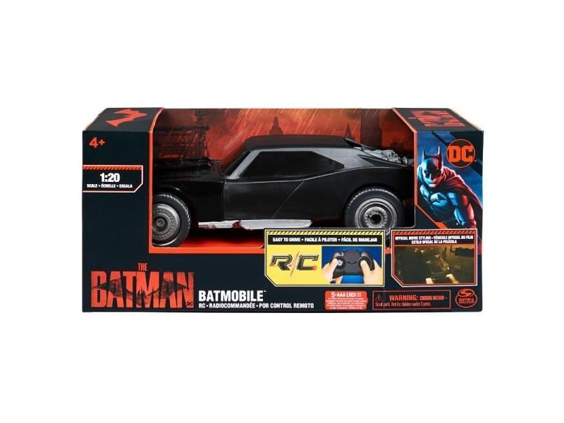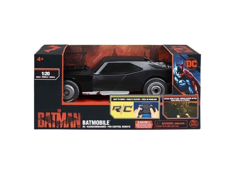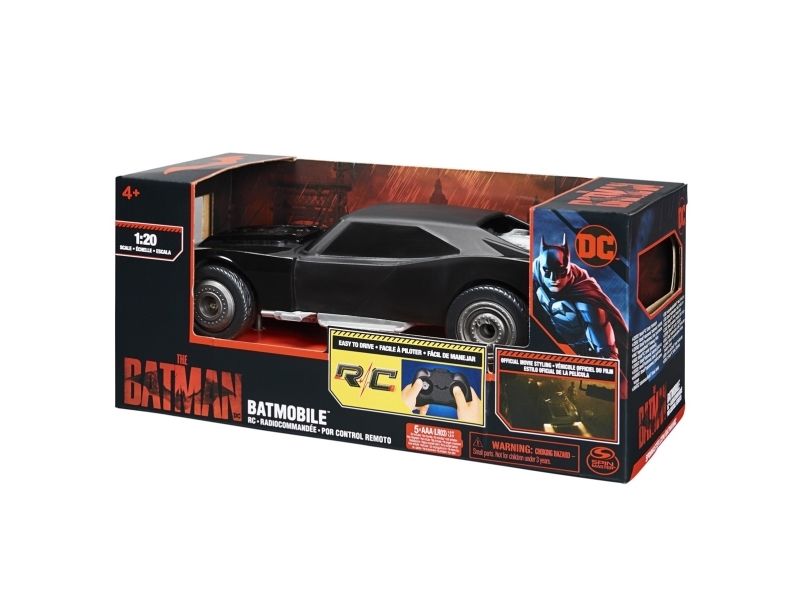 Race into action with the Batmobile RC in 1:20 scale! The remote control Batmobile features an easy-to-drive remote control, authentic The Batman movie styling and incredible details that bring your Batmobile to life. The Batman Batmobile is easy for kids to drive! The 2.4 GHz dual joystick remote control is USB rechargeable and features out-of-range sensors so you’ll know when your Batmobile needs to stay in range, recharge, and can speed into action again. True Batman fans will love this Batmobile and its detailed deco and movie-style sculpting, as seen in The Batman Movie, making it a great gift idea for Batman fans. DC fans of all ages love this Batmobile collectible, toy figures and playsets to engage their imagination and create their own epic Batman missions! Protect Gotham City with the Batmobile RC vehicle!