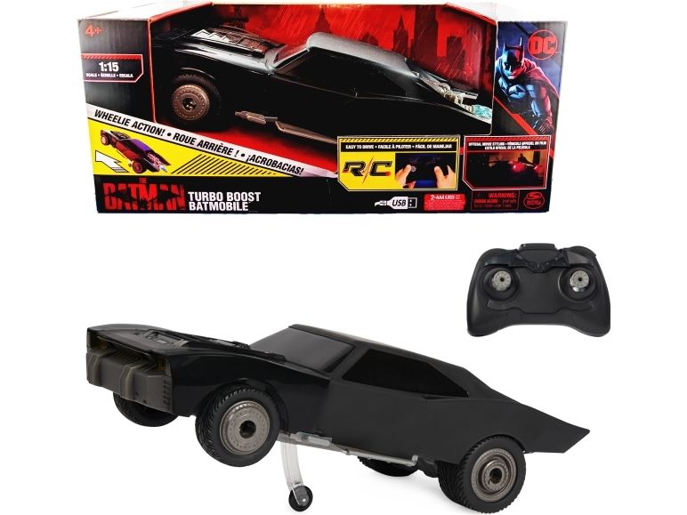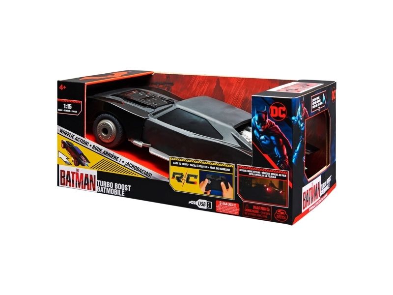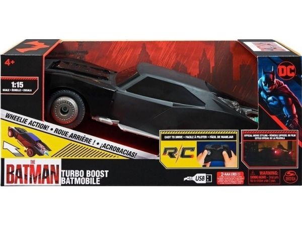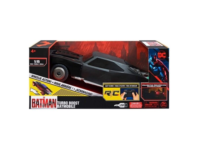 Includes: 1 Turbo Boost Batmobile, 1 Controller, 1 USB Charging Cable, 1 Instruction GuideDC Comics , The Batman Turbo Boost Batmobile, Remote Control Car with Official Batman Movie Styling Kids Toys for Boys and Girls Ages 4 and Up. Product type: Car, Scale: 1:15, Engine type: Electric engine, Recommended age (min): 4 yr(s). Battery technology: Lithium Iron Phosphate (LiFePO4)