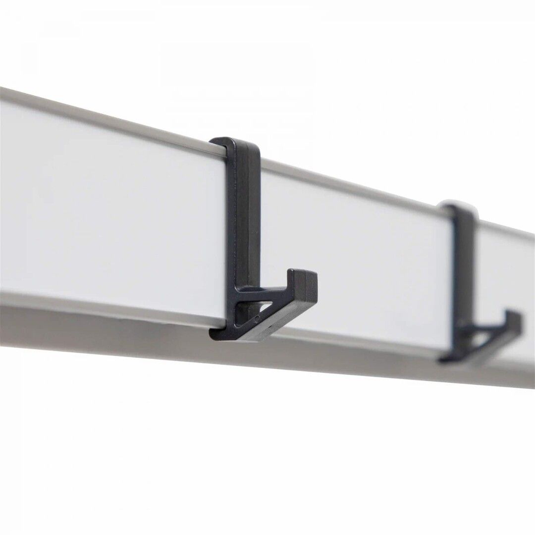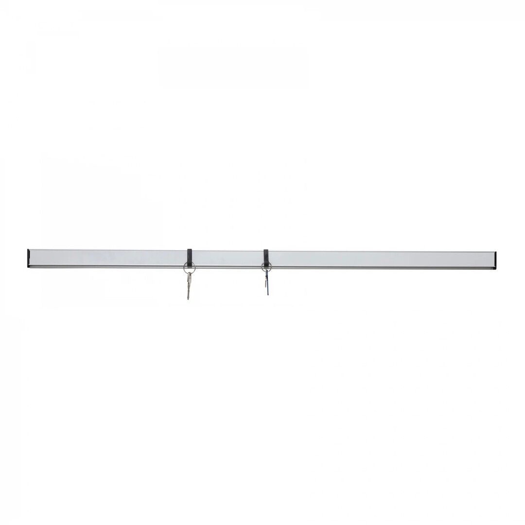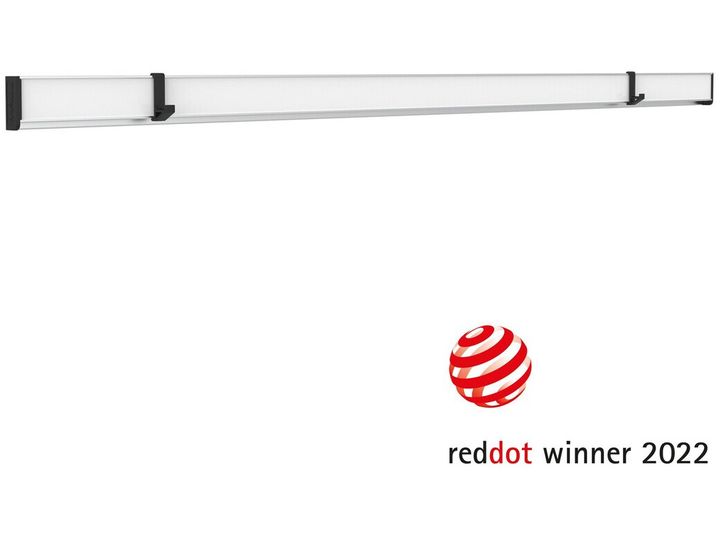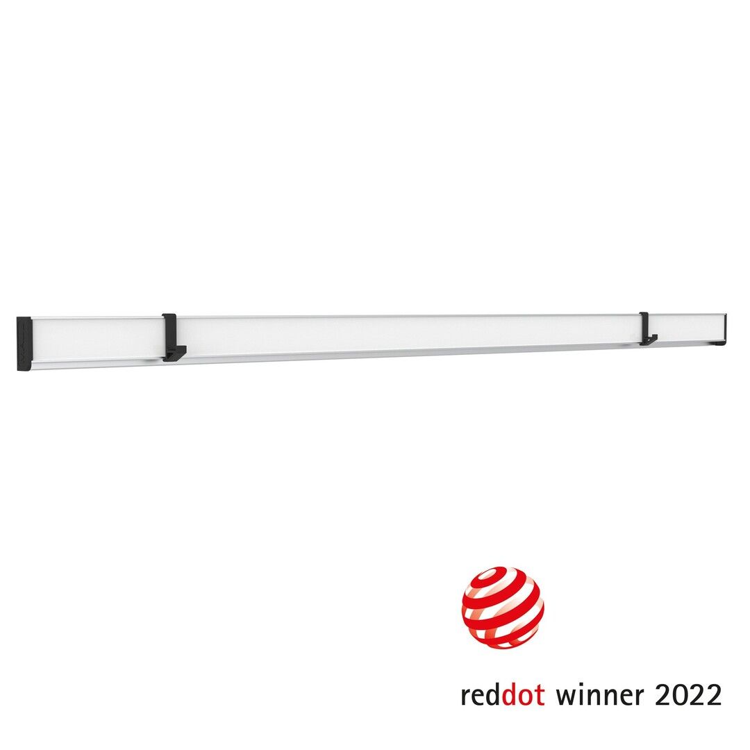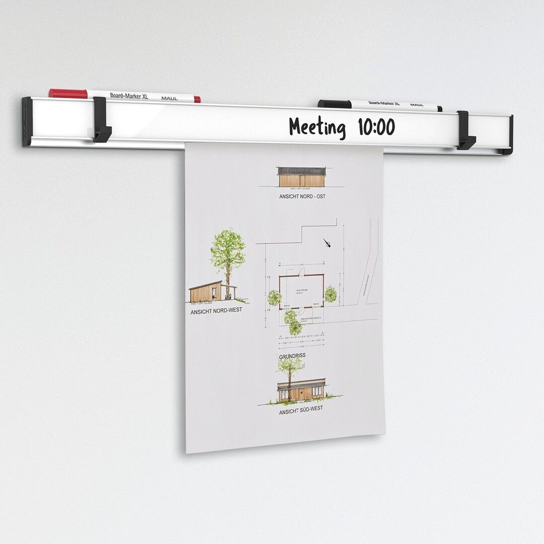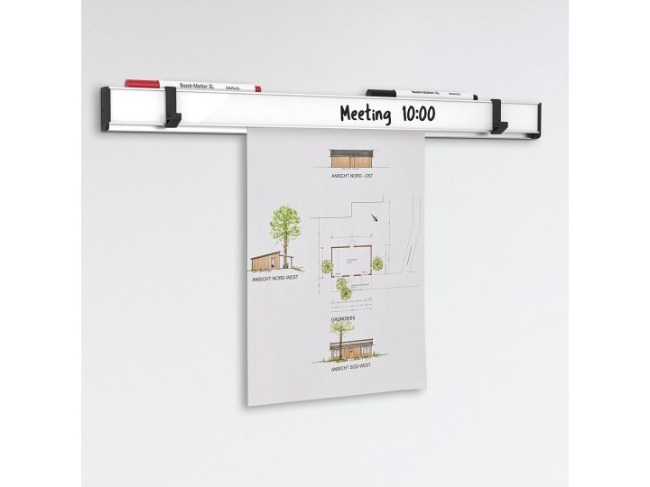 Kraftig, elegant og multifunktionel klemmeskinne Høj kvalitet, elegant, fladt design i aluminium. Bredde 4,2 cm. Dybde 1,5 cm. Længde 100 cm. • Indsæt blot et dokument nedefra, så holdes det automatisk og sikkert på plads i skinnen. • Magnetisk front til opsætning af billeder eller navneskilte med magneter. Der kan også skrives på skinnen med en whiteboard marker, og nemt viske ud igen. • Inklusiv: 2 multifunktionelle kroge, glidende og aftagelige til lette jakker, nøgler eller flipover-papir med huller på 11 mm. eller mere. • Rille på toppen til opbevaring af kuglepenne eller visning af kort, fotos mv. Diskret og permanent, til vedhæftning f.eks. tegninger, huskesedler, planer, fotos eller plakater. Nyttig overalt, på kontoret eller hjemmekontoret, på værkstedet, i gangen, køkkenet eller børneværelset. Praktisk fastgørelse enkeltvis eller på række til store haller eller lange gange. • Indføringshjælp til papiret, integreret i profilen • Strip fyldt med plastikruller: ingen fastklemning, papir kan skiftes hurtigt og nemt • Stabil tavleplade indrammet i aluminiumsprofil med plast endestykker • Der medfølger monterings materiale, med højdejusteringsfunktion for nem efterjustering efter montering. • Kan anvendes til papir fra 80 g/m² op til 1 mm tykt pap. • Tilbehør magneter, markere m.v. medfølger ikke. • Miljøvenlig, genanvendelig og sikker emballage. • Fremstillet i Tyskland af Maul, med over 100 års erfaring i metalproduktion. • Vinder af Red Dot Award: Product Design 2022. • 3 års garanti.