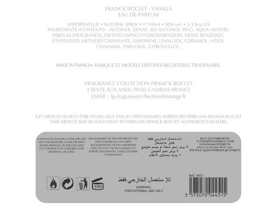 The French fashion designer and perfumer Franck Boclet launched this sweet and citrusy fragrance for men in 2015 Franck Boclet Vanille blends vibrant and fresh accords with a hint of masculine spiciness making it perfect for daytime or nighttime wear The top notes include juicy grapefruit cardamom and lime