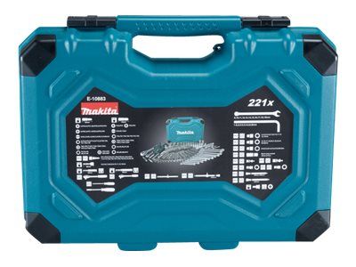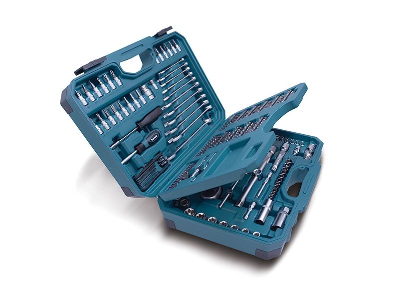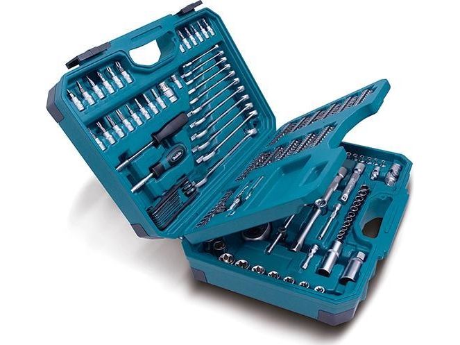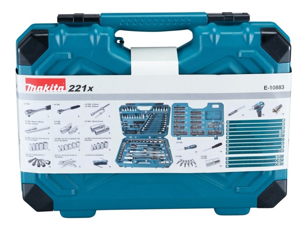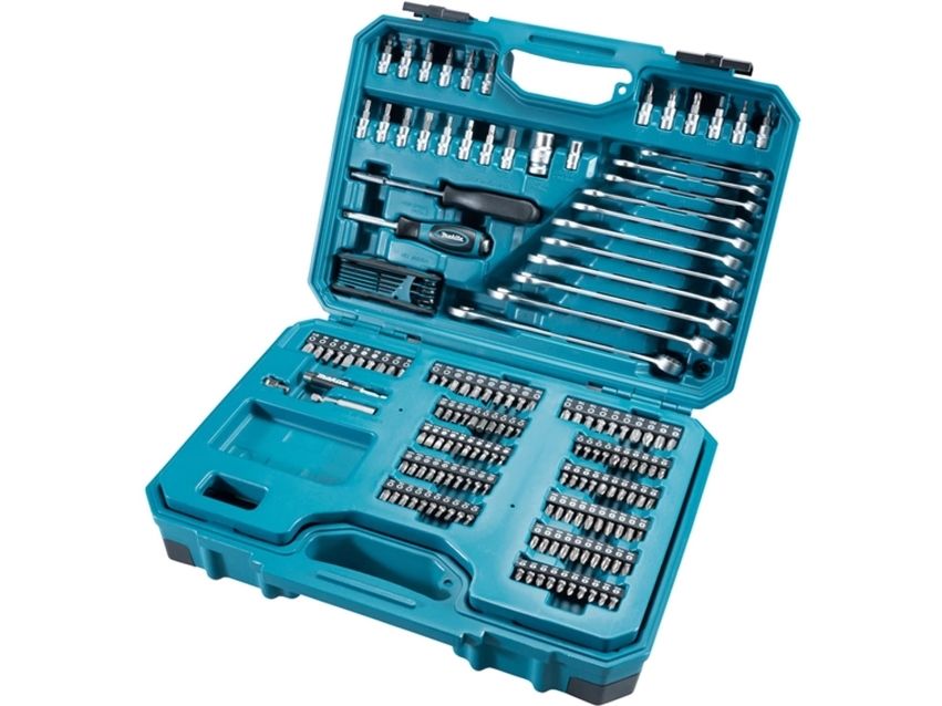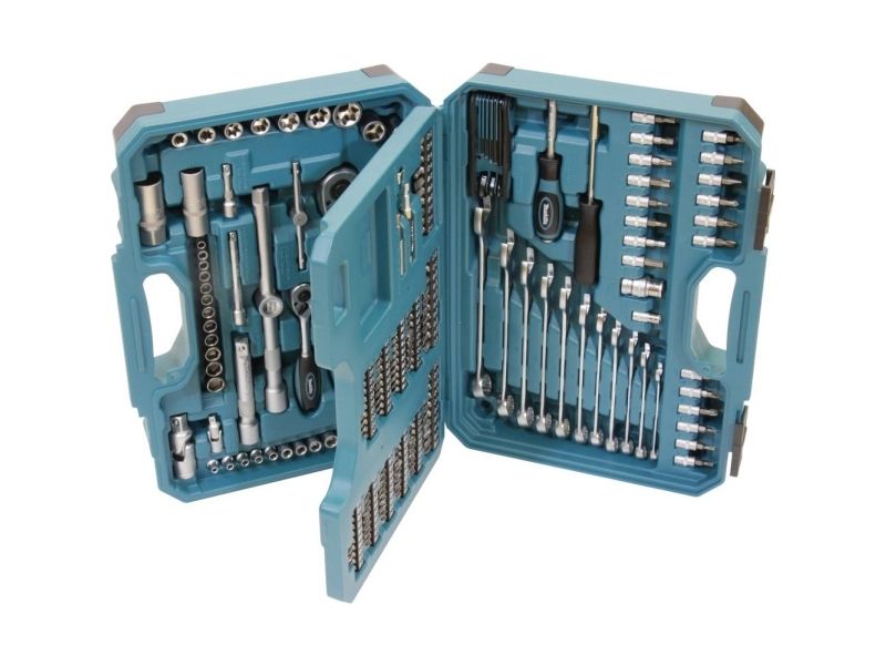 Magnetic bit holder - 60 mm, 2 tennpluggsokkler - 16, 21 mm, 2 ratcheting socket wrenches - 1/4", 1/2", 2 universal joints - 1/4", 1/2", 2 screwdriver bits 5/16" - pozidriv PZ3, PZ4 x 30 mm, 2 screwdriver bits 5/16" - phillips PH3, PH4 x 30 mm, adapter 1/4" hex to 1/4" square x 25 mm, screwdriver bit - phillips PH2 x 25 mm, bit adapter socket 1/2" to 3/8", magnetic screw guide sleeve - 80 mm, screwdriver - square 1/4", 11 combination wrenches - 8-19 mm, 8 hex keys - 1.5, 2, 2.5, 3, 4, 5, 6, 8 mm, 36 screwdriver bits - phillips PH0 (x5), PH1 (x2), PH2 (x20), PH3 (x5), PH4 x 25 mm, 10 screwdriver bits - pozidriv PZ0 (x2), PZ1 (x2), PZ2 (x3), PZ3 (x2), PZ4 x 25 mm, 10 screwdriver bits - slot 3 (x2), 4 (x2), 5 (x2), 5.5 (x2), 6.5 (x2) x 25 mm, 10 screwdriver bits - hex H3, H4, H5, H6, H7, H8, HH3, HH4, HH5, HH6 x 25 mm, adapter 1/4" hex to 1/4" square x 30 mm, 12 socket wrenches 1/4" - 5, 5.5, 6, 7, 8 (x2), 9, 10 (x2), 11, 12, 13 mm, 7 screwdriver bits 5/16" - torx T25, T27, T30, T35, T40, T45, T50 x 30 mm, 7 screwdriver bits - tamper-proof torx 5/16" - TH25, TH27, TH30, TH35, TH40, TH45, TH50 x 30 mm, 5 screwdriver bits 5/16" - hex H4, H5, H6, H7, H8 x 30 mm, 3 screwdriver bits 5/16" - slot 6, 7, 8 mm x 30 mm, 1/4" T-handle, 2 extension bars 1/4" - 125 mm, 250 mm, 2 extension bars 1/2" - 50 mm, 100 mm, 24 sockets 1/4"- 4, 4.5, 5, 5.5, 6, 7, 8, 9, 10, 11, 12, 13, 14, 15, 16, 17, 19, 20, 21, 22, 24, 27, 30, 32 mm, 7 sockets 1/4" - torx E E10, E12, E14, E16, E18, E20, E24, 3 socket bits 1/4" - phillips PH1, PH2, PH3, 3 socket bits 1/4" - pozidriv PZ1, PZ2, PZ3, 3 socket bits 1/4" - slot 4, 5, 6 mm, 7 socket bits 1/4" - torx T10, T15, T20, T25, T27, T30, T40, 4 socket bits 1/4" - hex H3, H4, H5, H6, screwdriver - hex 1/4"
