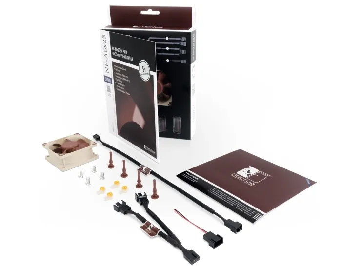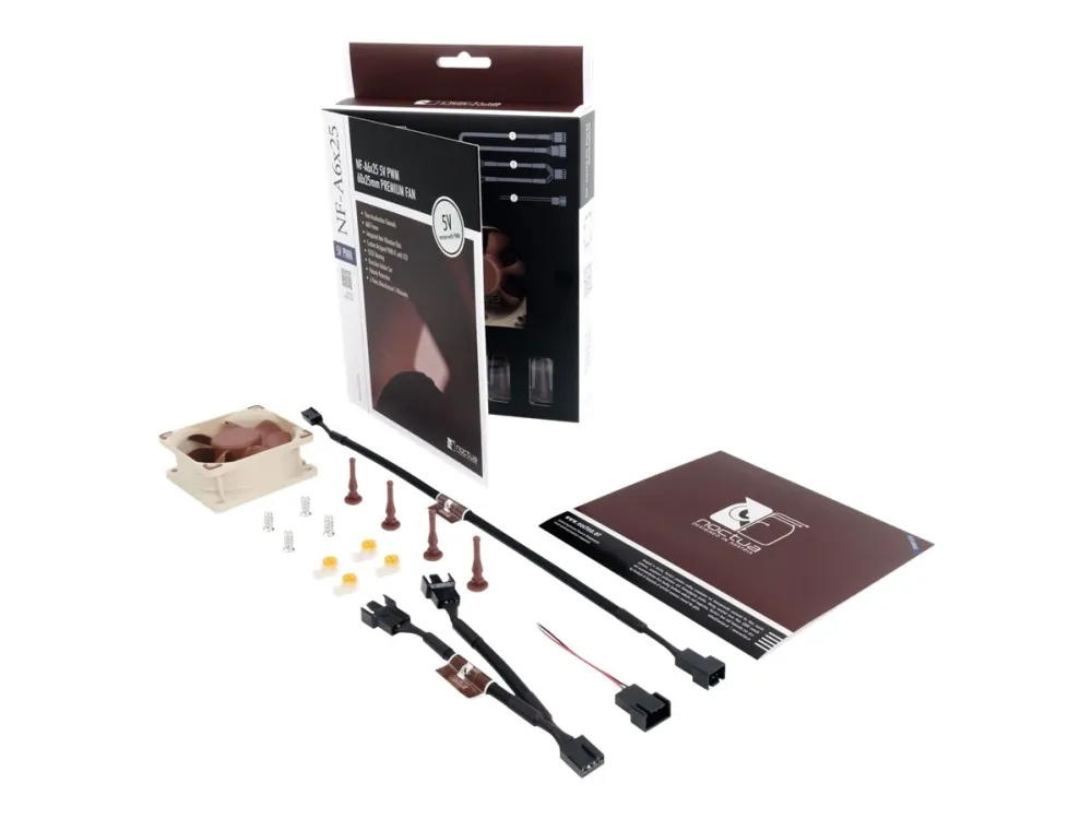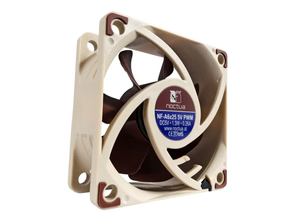 Featuring advanced aerodynamic design measures such as Flow Acceleration Channels and an AAO frame, the NF-A6x25 5V PWM is a PWM-enabled 5V variant of Noctua's highly optimised, premium-quality quiet fan.
