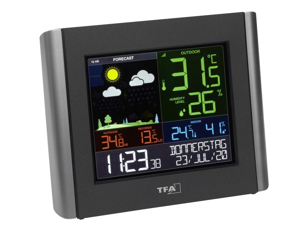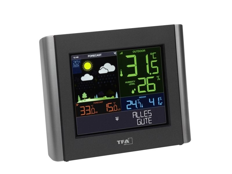 Værmeldingsikon, duggpunktdisplay, varmeindeks, alarmfunksjon, maks/min funksjon, kalender, 3 nivåer av displaylysstyrke, utendørssensordrift med 2x AA-batterier, 3x AA batteries base station operation
