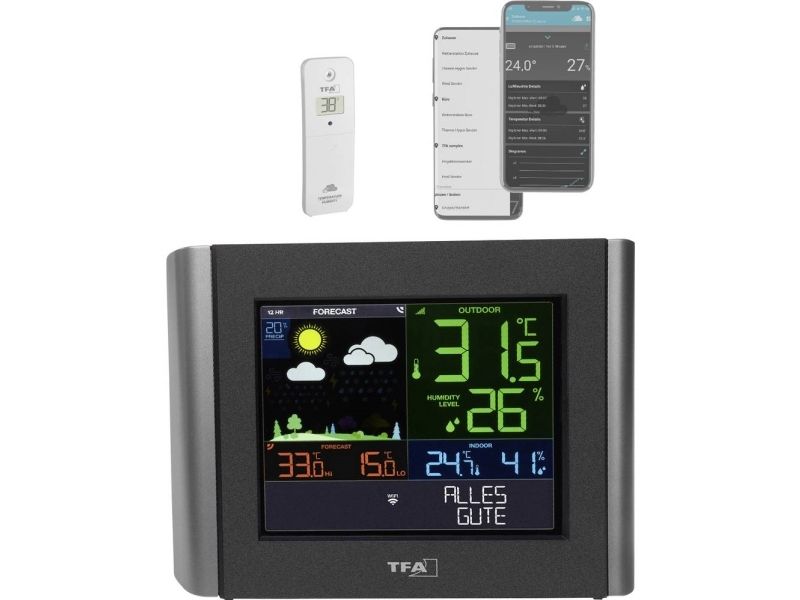 Utendørs temperatur: -40 °C til 60 °C Utendørs fuktighet: 10 % til 99 % Innendørs temperatur: 0 °C til 50 °C - nøyaktighet: +/- 1 grad Innendørs fuktighet: 10 % til 99 % - nøyaktighet: +/- 5%