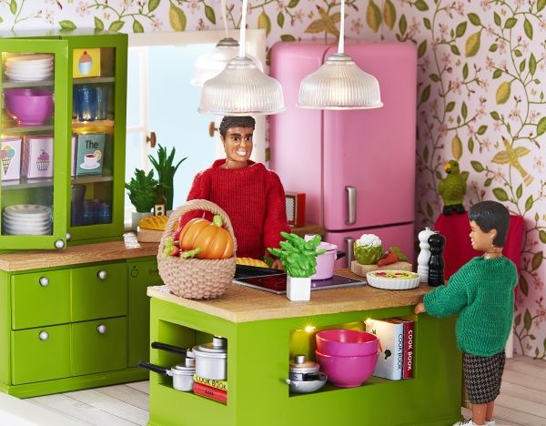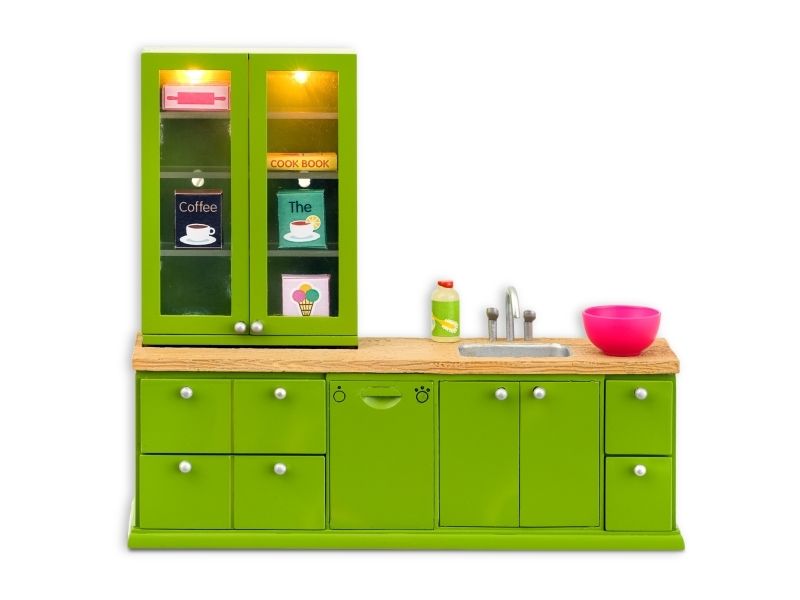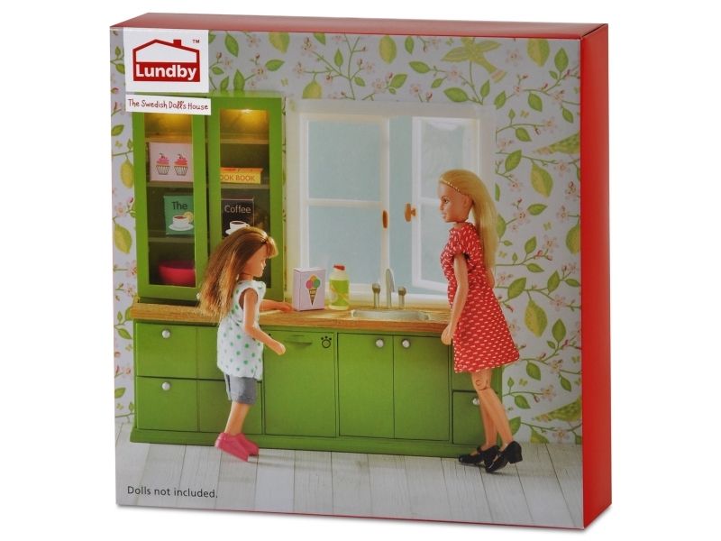 Kjøkkenet er selve hjertet i huset! Innred dukkehuset med en elegant, grønn kjøkkenbenk, oppvaskkum og oppvaskmaskin med detaljer av tre. Kjøkkenet har skap og skuffer som kan åpnes og lukkes, samt et vakkert vitrineskap med belysning. Elektrisk tilbehør fra Lundby må bare brukes i Lundbys dukkehus med omformer fra Lundby.