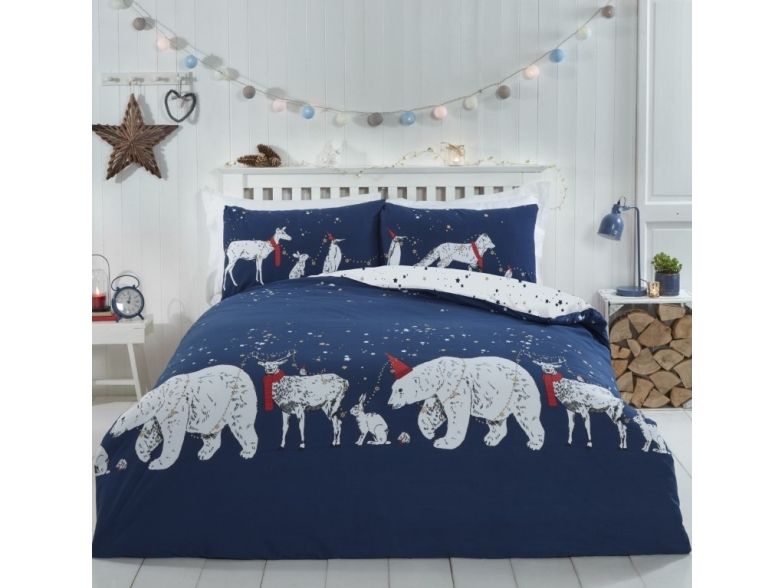 Dette slående design er den perfekte tilføjelse til dit soveværelse denne vinter. Med en legende dyreparade under midnatshimlen. Bagsiden har et sødt stjerneprintdesign, hvilket gør dette helt vendbart.
