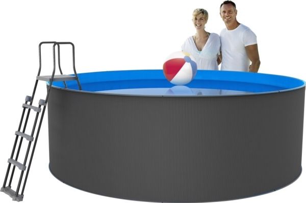 Santorini Family-basseng Ø 3,5 er produsert i galvanisert stål, i en antrasittgrå farge som passer inn i et moderne hagemiljø. Bassenget rommer 8150 liter og har god plass til de fleste vannleker.