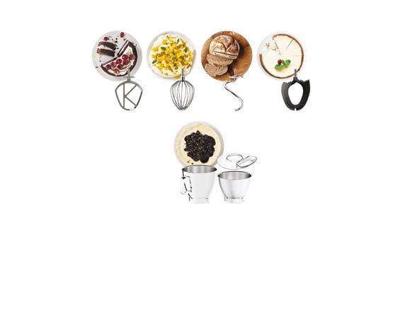 Skål (5 l), kremvisp, deigkrok av rustfritt stål, K-agitator av rustfritt stål, ballongvisp i rustfritt stål, skål (7 l)