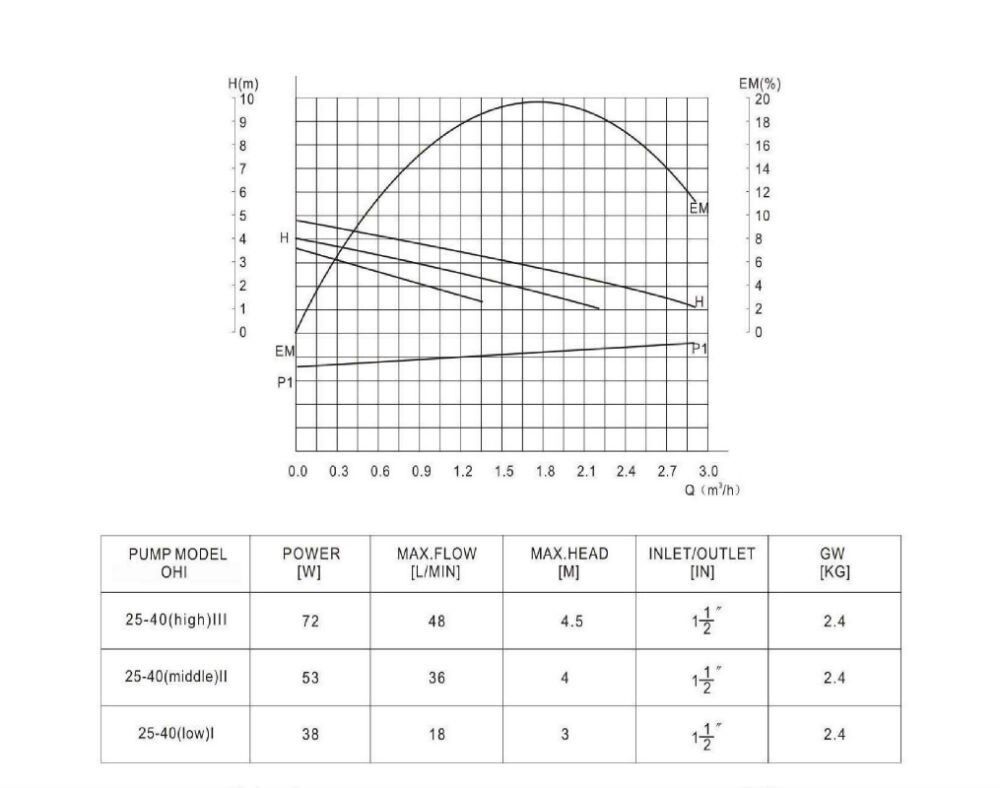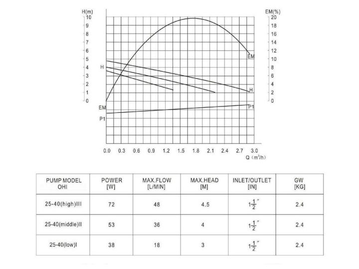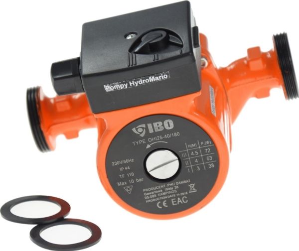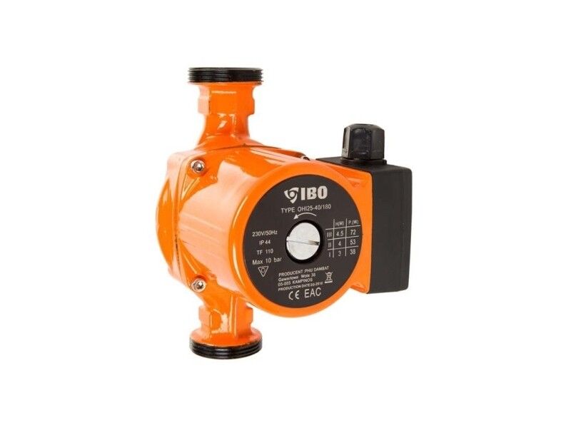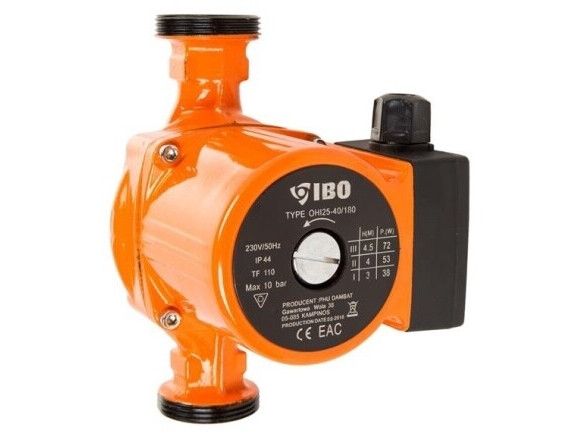Brand- IBO. Model- OHI 25-40, 180 mm. Power- 38 - 72W. Voltage- 230 V. Frequency- 50 Hz. Maximum working pressure- 10 Bar. Mandatory warranty- 24 mo. Warranty for legal entities- 12 mo. Additional information- Pumps, OHI series, suitable for potable water circulation. Pumps OHi series can be used in systems where only water circulates..