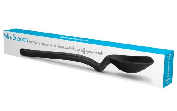 Mini Supoon er mini-varianten af Dreamfarms klassiker Supoon - verdens bedste grydeske. Den har en flad gummiskraberspids og fleksible skrabesider, som gør den fantastisk til at skrabe den sidste lille rest ud af en beholder eller et nutellaglas. Skeen kan også bruges til præcist teskemål under madlavning og bagning, og er designet med et knæk på håndtaget, som gør, at den ikke kommer i kontakt med underlaget. Materiale er nylon og silikone. Tåler opvaskemaskine. Fri for BPA.