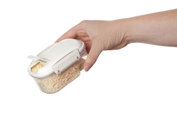 285ml Mini Bakery. Sistema Mini Bakery er perfekt til opbevaring af bageingredienser som eks. nødder, mandler, drys, krymmel, krydderier og tørret frugt. Boksen er lufttæt med gummipakning i låget, og låget har praktisk kliklåg til at hælde og drysse for nem dosering. Der er indbygget håndtag i siden for bedre greb, og boksen kan stables med de øvrige størrelser i Bakery-serien. Mini Bakery tåler fryser, opvaskemaskine og mikroovn (uden låg). Phthalat & BPA fri.