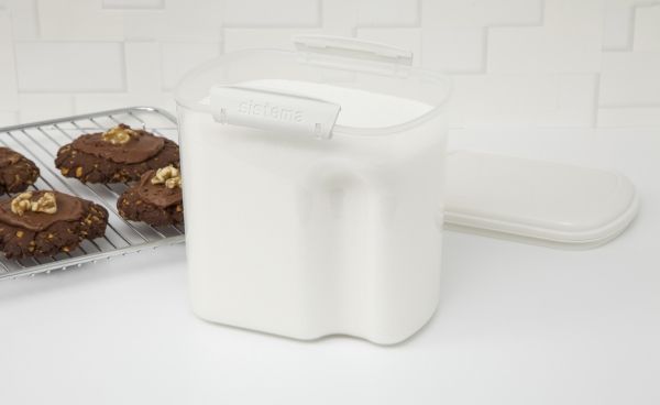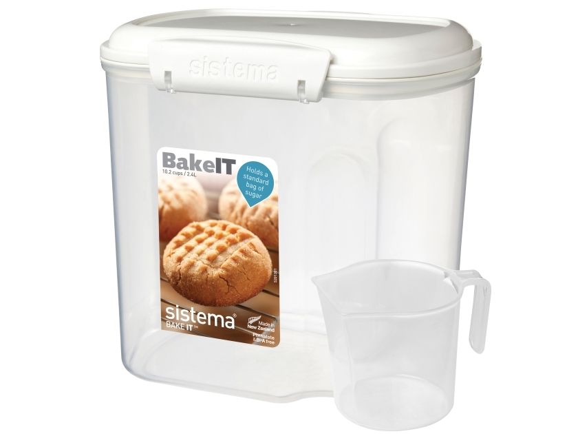 Bake It 2,4l + Cup. Hold orden i dine køkkenskabe og skuffer og bevar dine bageingredienser friske i de flotte opbevaringsbokse i Sistema® Bake It™ serien. Meget anvendelig til bl.a. sukker, mel, gryn, morgenmadsprodukter og meget andet. Inkl. målebæger. Sistemas® patenterede nemme låseclips og fleksible forsegling sikrer, at indholdet forbliver frisk i længere tid. Boksene er nemme at tage ud fra køkkenskabet, da de har en indbygget fordybning i siden, der gør dem nemme at få fat i. Dette produkt kan stables, kan bruges til opbevaring af tørre ingredienser i dit skab eller skuffer, fødevarer i køleskabet eller i din fryser. Endvidere er produktet sikkert at bruge i opvaskemaskinen (i øverste kurv) samt mikroovnen (uden låg). Phthalat & BPA fri.