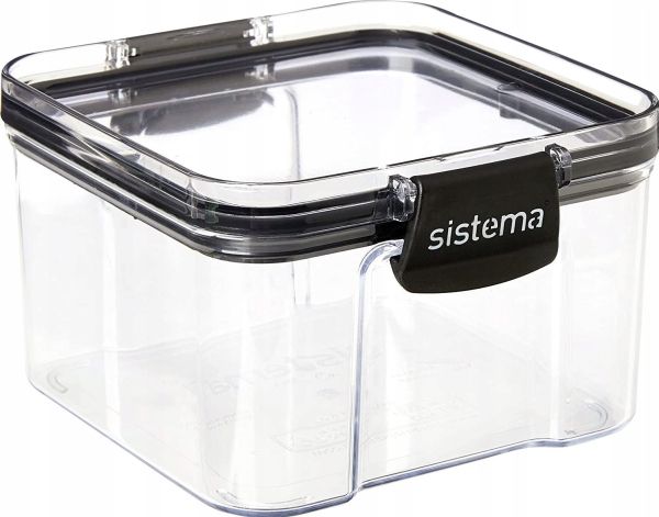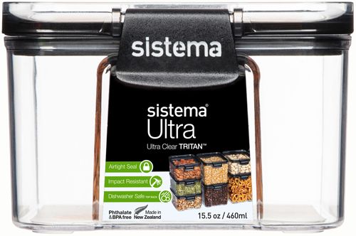 Tritan Ultra Square 460ml. Elegant opbevaringsserie i tritan plast fra Sistema® Ultra™. Ultra er en serie af krystalklare, glaslignende opbevaringsbeholdere i en meget slidstærk og brudsikker form, som er både stabelbar, pladsbesparende og effektiv for din køkkenorganisation. Med Sistemas nemme, tætsluttende låseclips og lufttætte forsegling, der holder indholdet frisk i længere tid. Ultra serien med det elegante design passer perfekt til at stå fremme i køkkenet, men er også særdeles velegnet til både skuffer og skabe. Opbevar nemt pasta, havregryn, mel, sukker, nødder og meget andet nemt og elegant. Boksene er nemlig udført i et flot design med et sort og klart låg, som gør det nemt at se, hvad boksene indeholder. Tåler opvaskemaskine (i øverste kurv). Phthalat-fri og BPA-fri.