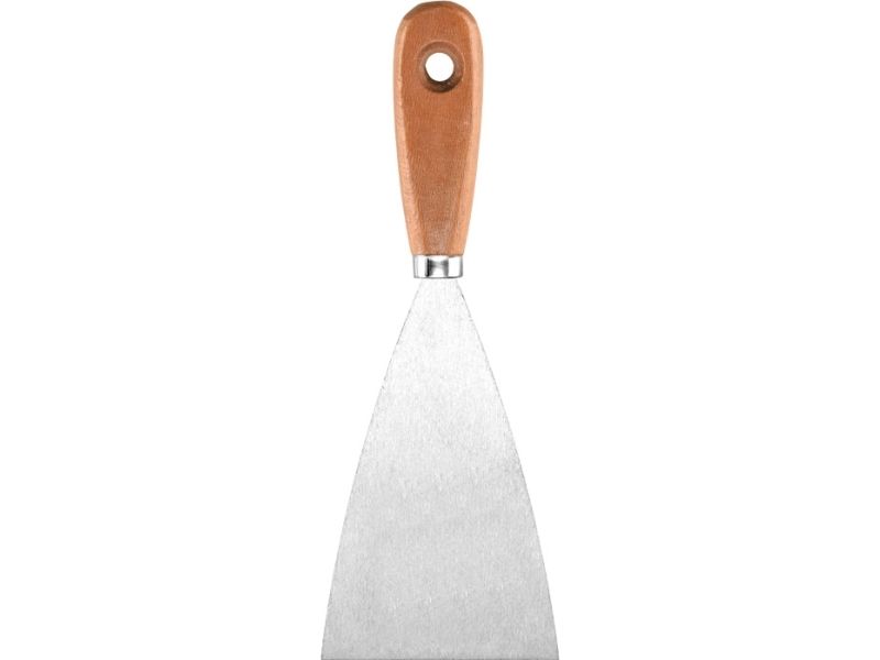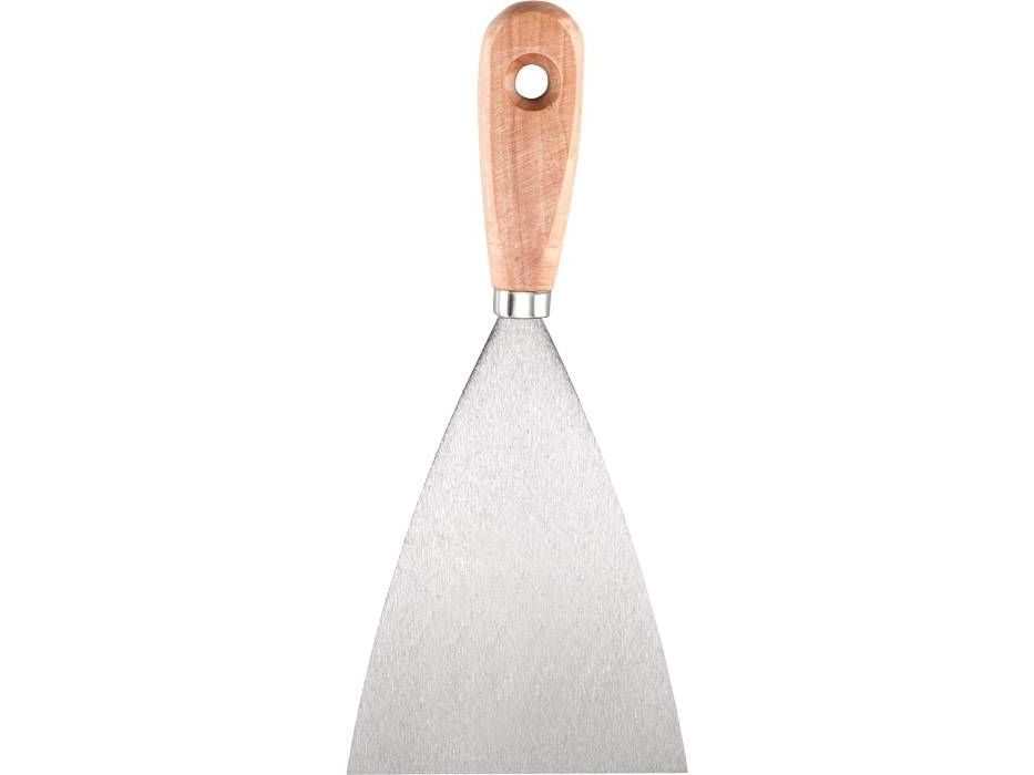 Metalblad, fleksibel, lakeret klart med træhæfte, til fjernelse af tapet på overfladen, i hjørner og på kanter, til påføring af spartelmasse og klæbestoffer, til fjernelse af limrester og urenheder, ideal for arbejde med kalk, beton og træ, spartelmasse kan påføres rent med malerspartel, Fjerner ubesværet rester fra lim og sammenpressede urenheder