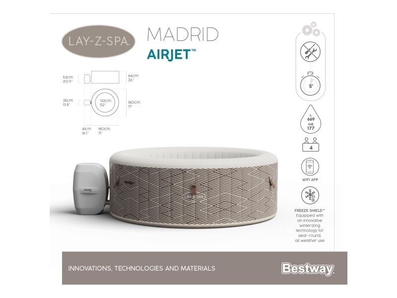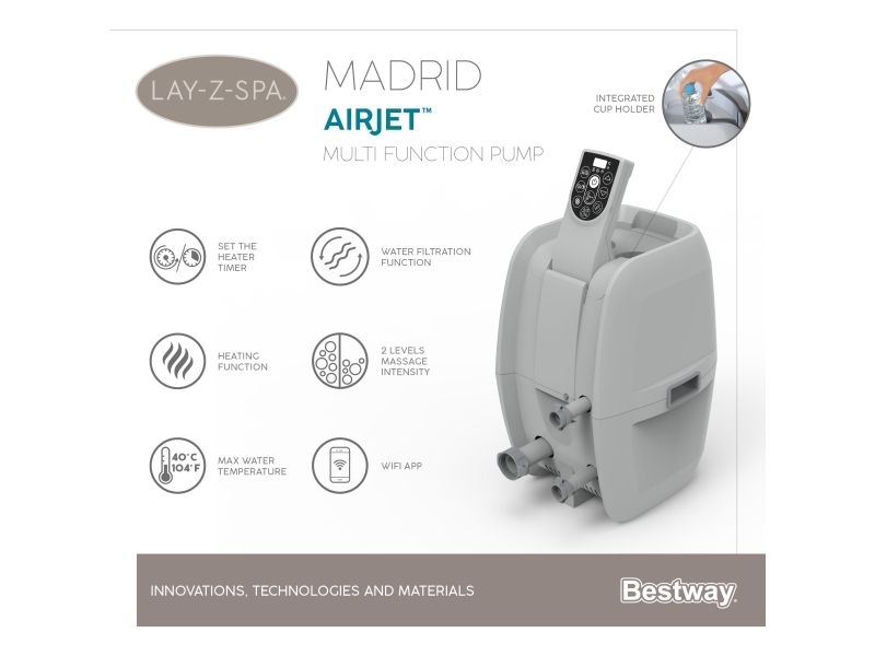 Control at Your Fingertips: This unique spa can be controlled from your smart device through the Bestway Smart Hub App. This new innovation makes the Madrid one of the most convenient spas on the market. The app lets you set your spa to the perfect temperature, activate the Power Saving Timer, run the water filter and control the AirJet massage system - all from the palm of your hand.