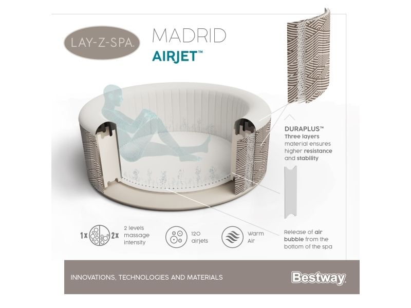 After a long day, there’s nothing more relaxing than sinking into warm, bubbling water right in your own backyard. The Lay-Z-Spa Madrid AirJet provides an enhanced, soothing massage experience for up to 4 people, while still being quick and easy to set up. This spa reaches up to 40ªC (104ªF) to provide ultimate relaxation as you are surrounded by 120 AirJet massage bubbles. Simply attach the pump and watch as it inflates.