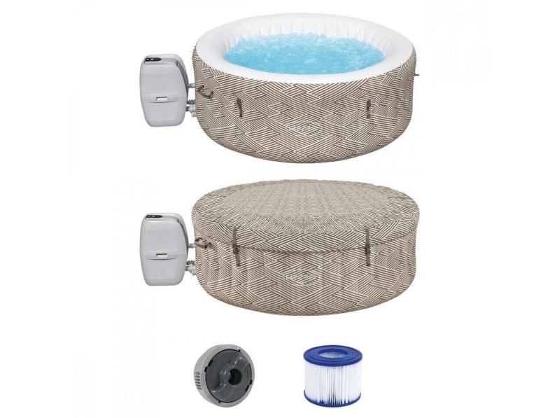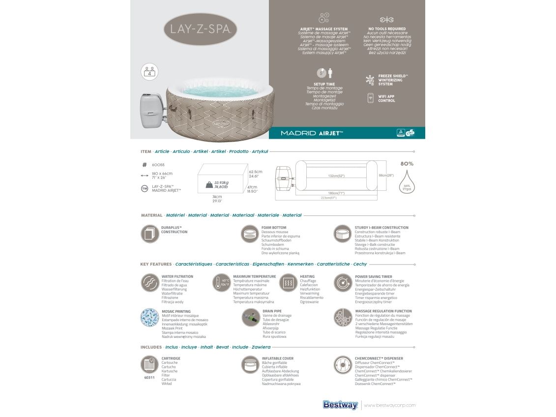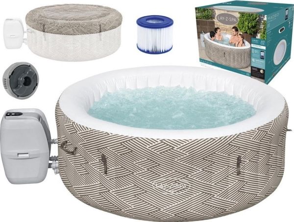 Contents: Equipped with a pump that quickly inflates the spa, heats it up, runs filtration and controls the massage system, this spa is both easy and convenient. The pump can easily be reached from inside the spa and features cup holders for drinks and snacks. Also included is a ChemConnect dispenser that maintains clean, healthy water by evenly dispersing the proper amount of chlorine. To top it all off, the Madrid spa comes with a reinforced cover that locks in heat while not in use, as well as keeping dust and debris from collecting on the water.
