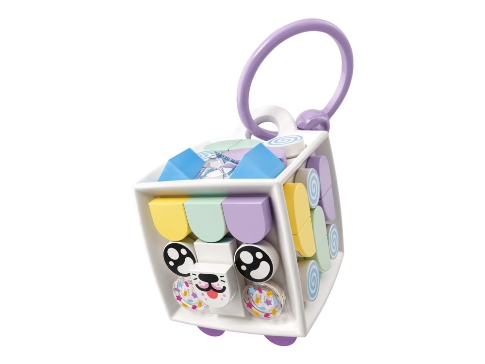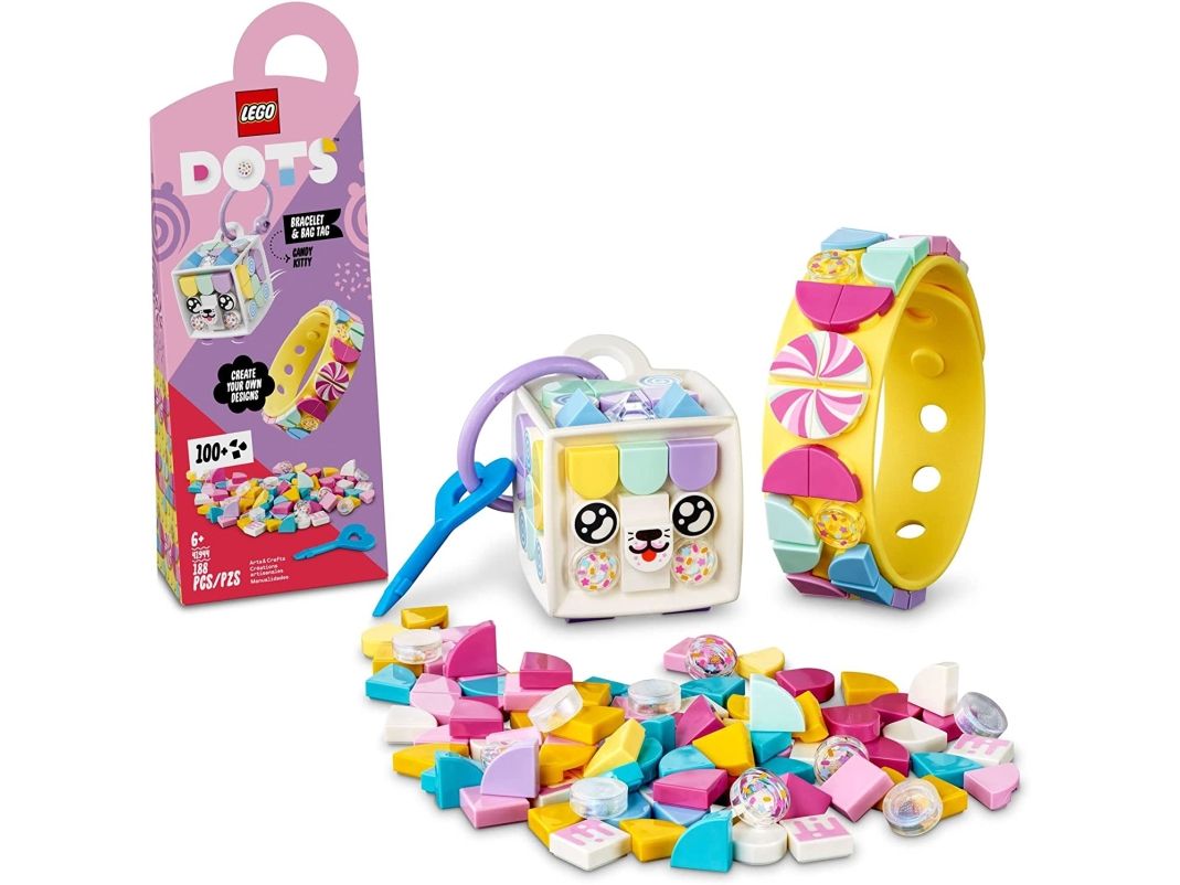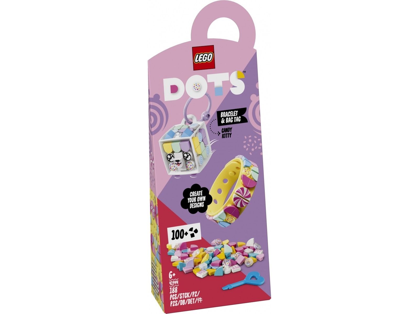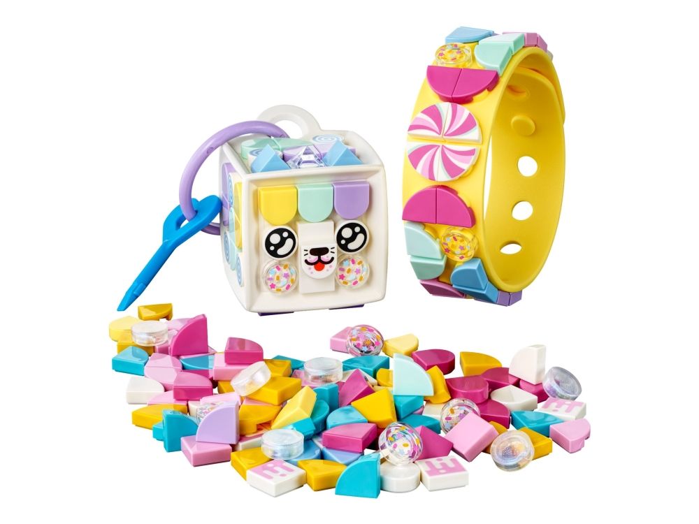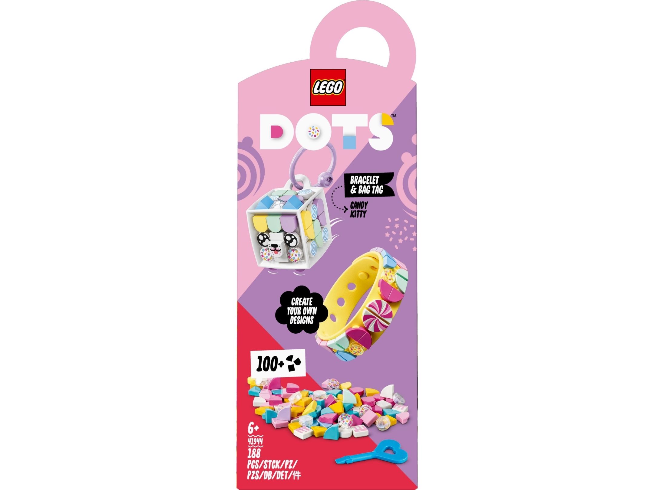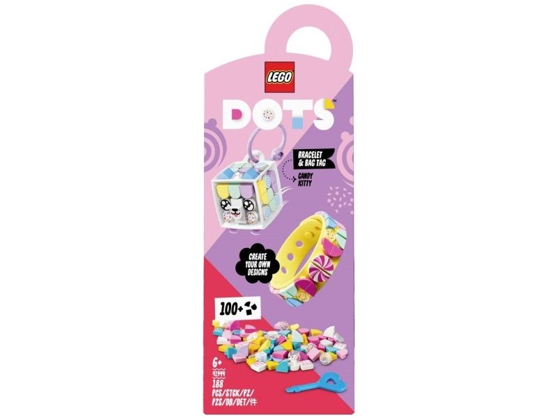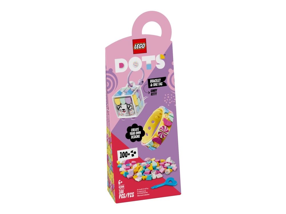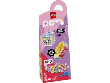 1. Design, ha på, fest på bag, del – overrask en fan av hobbysett med LEGO® DOTS Godtekatt – armbånd og bag-merke (41944). Den kreative leken starter så snart posen åpnes