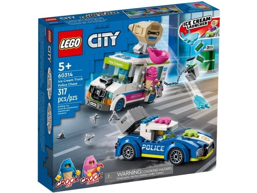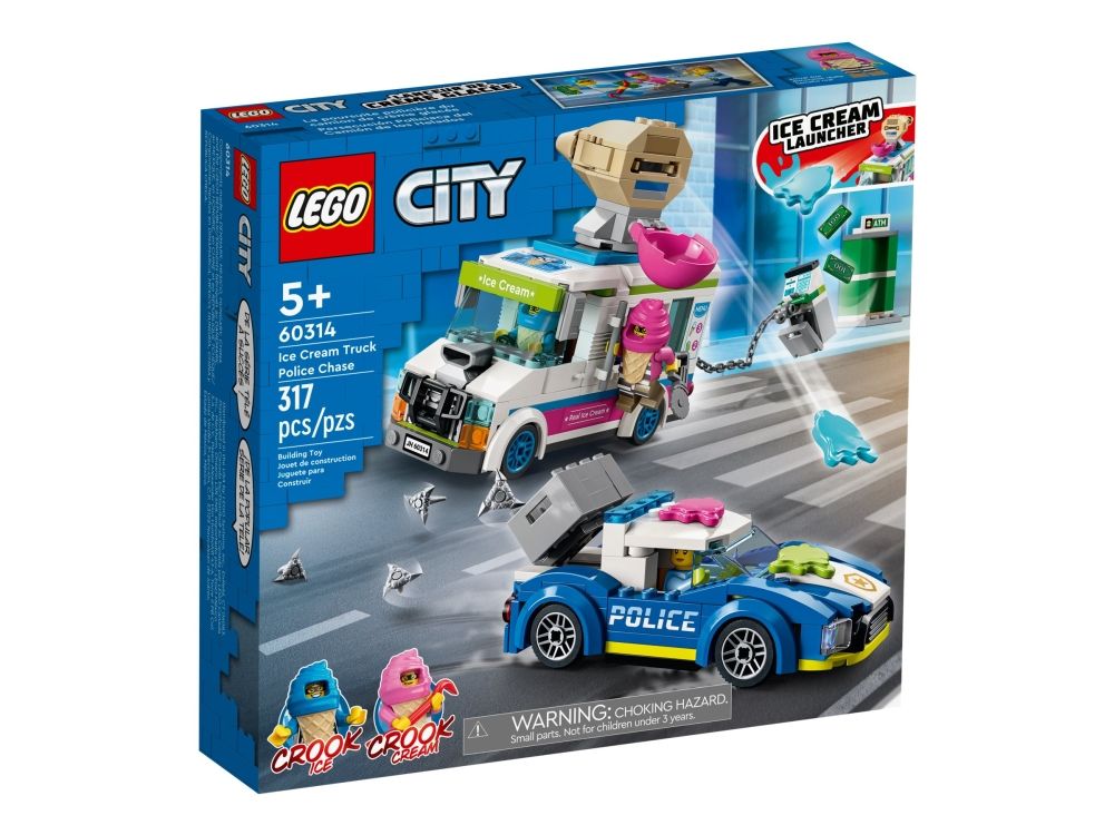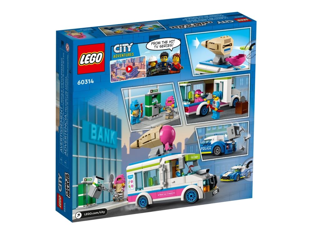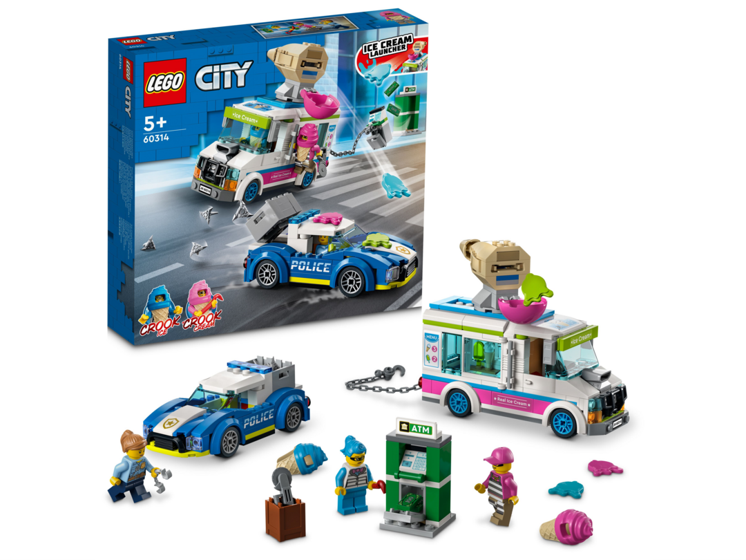 Med LEGO City Politijakt på isbilen (60314) kan barn gjenskape scener fra LEGO® City Adventures TV-serien. Settet inkluderer en spesialkonstruert isbil med iskremkaster og politiets innsatskjøretøy med dekkfreser. Det er bare å legge til to beryktede iskremskurker og politibetjent-minifigurer så er det duket for timevis med actionfylt lek.