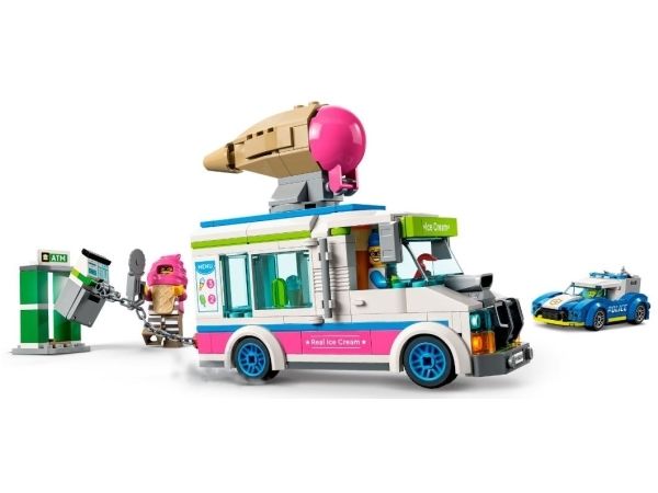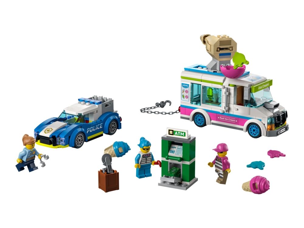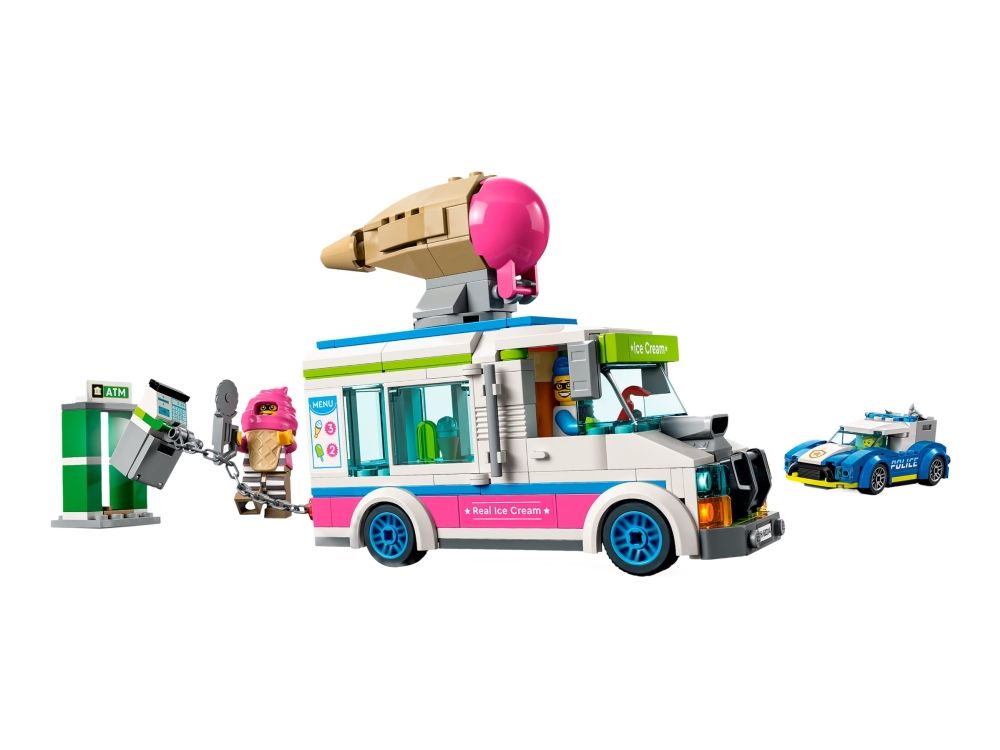 2. Hva inneholder esken? Alt barn trenger for å bygge skurkenes fargeglade isbil, politiets innsatskjøretøy og en minibank, samt tre minifigurer, inkludert to fra LEGO® City TV-serien