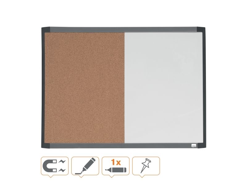 Quartet magnetic combination boards feature a magnetic dry-erase surface and a cork notice board in one frame for really flexible display. The boards include mounting magnets, foam adhesive tape, a magnetic rewritable dry erase marker and two magnets.