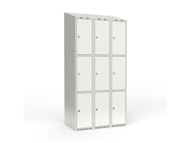 Skoleskab, helsvejst 3x300 med skråt tag. 3 rum i højden. Lys grå kabinet (RAL 7035) med pulverlakeret ståldør grå (RAL 7040). Leveres med færdigmonteret cylinderlås ASSA 8450 H. Totalmål (b x d x h) 900 x 550 x 1900 mm.
