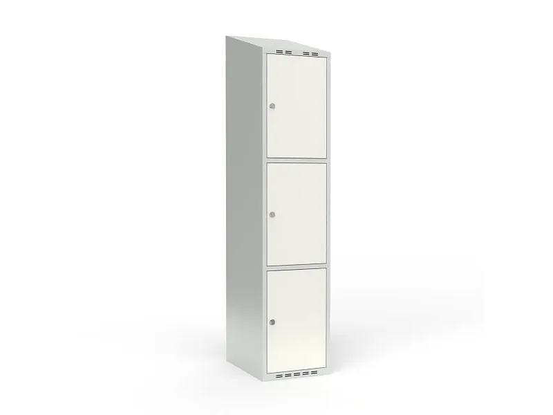 Skoleskab, helsvejst 1x400 med skråt tag. 3 rum i højden. Lys grå kabinet (RAL 7035) med pulverlakeret ståldør lys blå (RAL 5012). Leveres med færdigmonteret cylinderlås ASSA 8450 H. ASSA H8450 Totalmål (b x d x h) 400 x 550 x 1900 mm.