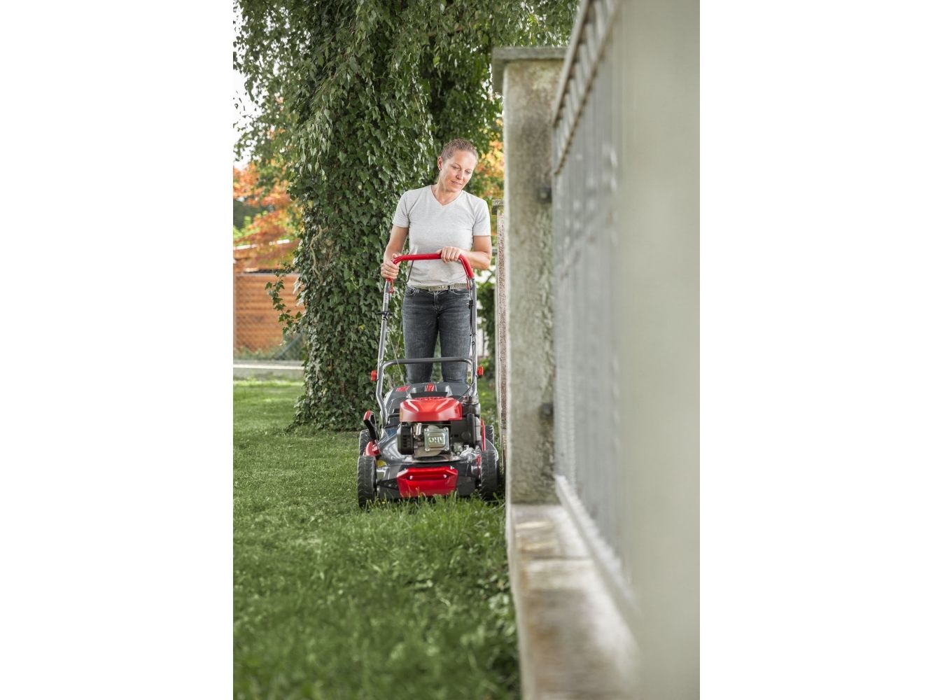Bensingressklipper AL-KO Comfort 46.0 SP-A Plus, Smart og komfortabel, slik presenterer AL-KO Comfort 46.0 SP-A Plus bensingressklipper fra AL-KO seg. Denne gressklipperen er utviklet i Tyskland og produsert i Østerrike, og byr på høyeste kvalitet. Det moderne designet gjør den til et blikkfang i enhver hage. De utvalgte komponentene og materialene forlenger bensinklipperens levetid. Med gressklippere fra "Comfort"-serien blir gressklippingen en ren fornøyelse. Tekniske detaljer om den bensindrevne gressklipperen AL-KO Comfort 46.0 SP-A Plus Med en klippebredde på 46 cm sikrer den bensindrevne gressklipperen AL-KO Comfort 46.0 SP-A Plus rask tilgang selv i mellomstore hager (opptil 1400 m²). Klippehøyden kan justeres sentralt i opptil 7 trinn fra 30 mm til 80 mm. Den kraftige AL-KO Pro-motoren på 2,1 kW har også utmerket effektivitet. Siden den er selvgående (1 gir), er hagearbeidet enkelt. 4INONE-funksjonen gir mulighet for klipping, oppsamling, bioklipp, mulching og sideutkast. Det ergonomiske håndtaket øker komforten under arbeidet. MaxAirflow-teknologien sørger for at gressavfallet sendes gjennom det ekstra høye stålskjoldet til oppsamleren på 60 liter, som er fylt til randen og ikke trenger å tømmes så ofte.