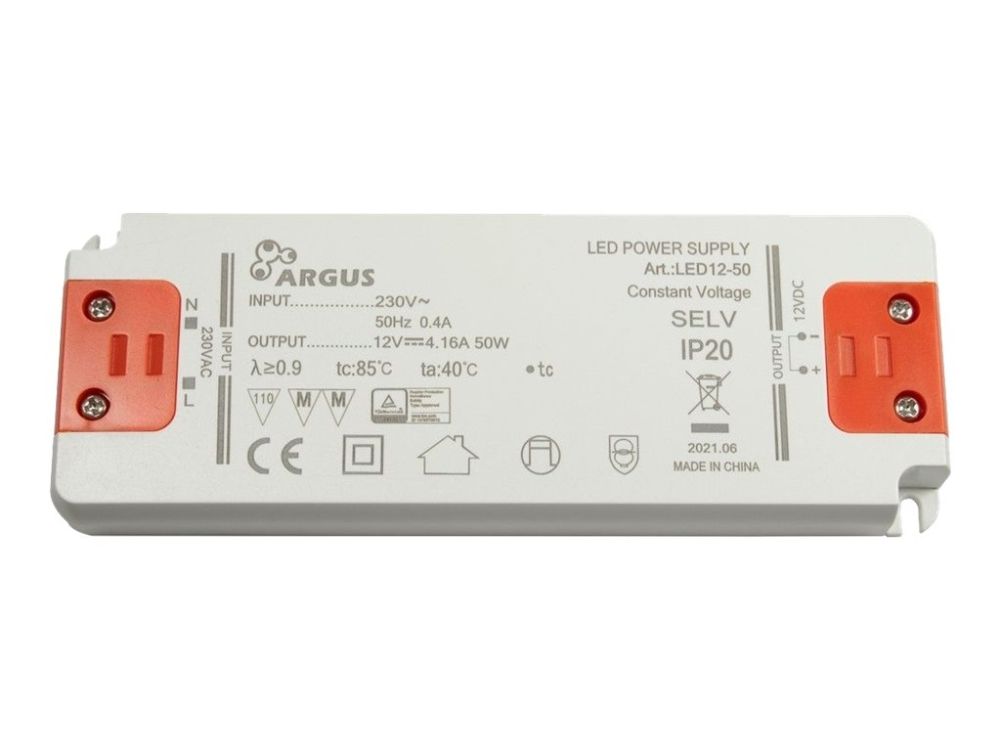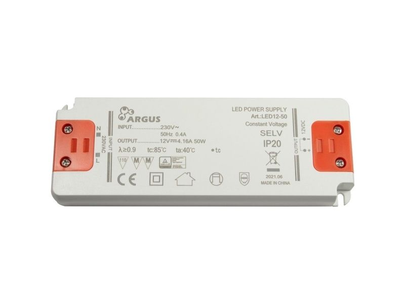 The LED12-50 is a 50W powerful LED driver with 12V output voltage at 4160mA. It is equipped with five protective circuits to protect the connected components, has an MTBF of 100.000 hours and is certified with protection class IP20.