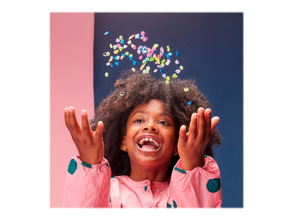 Posen inneholder 118 fargerike fliser, inkludert neonfargede, gjennomsiktige fliser, charms formet som hjerter og lyn, og 10 av 16 mulige spesialfliser med grafisk trykk. Dermed utvikler barn sine kreative ferdigheter mens de dekorerer armbåndene og interiørsettene sine akkurat slik de vil.