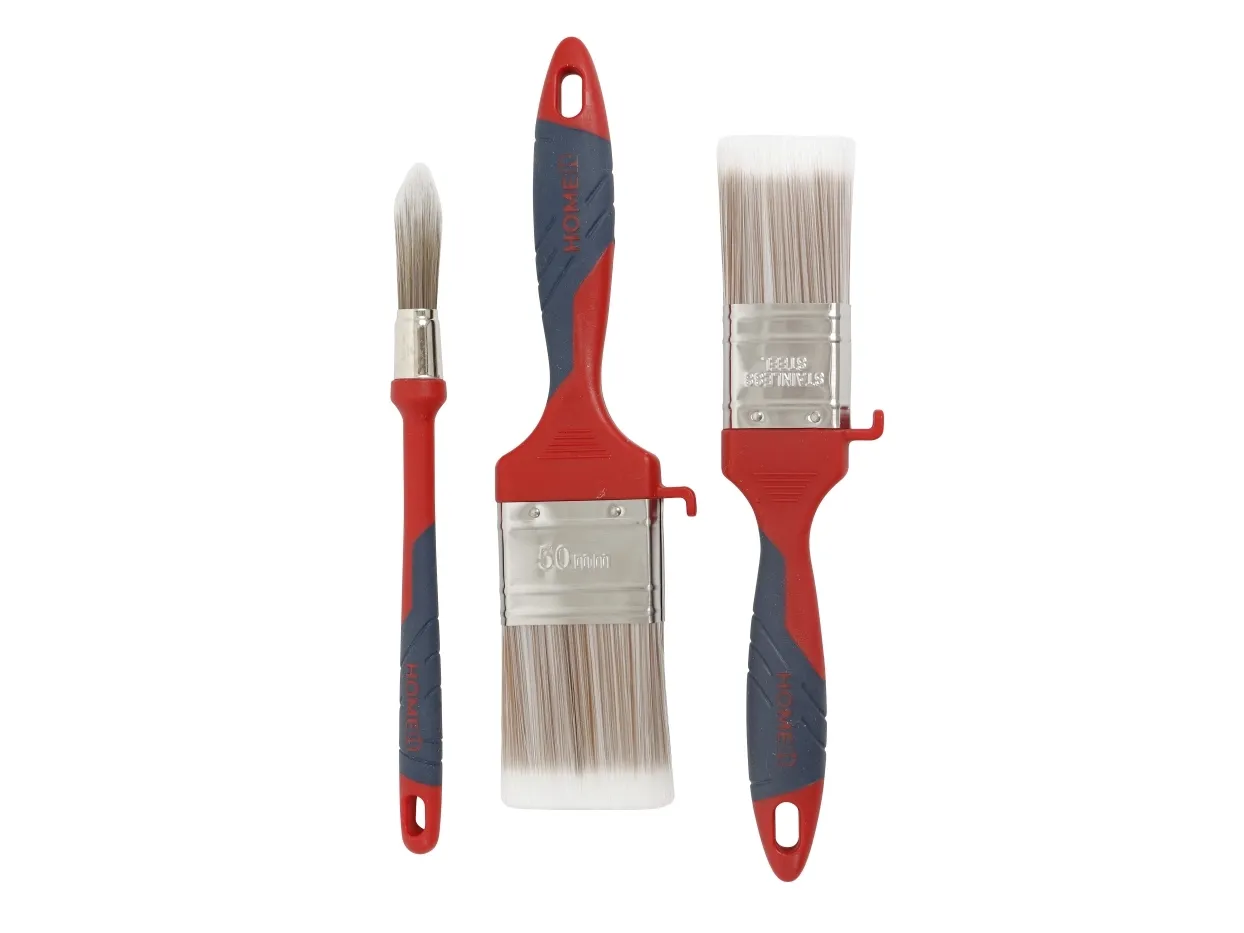 Antal: 3 Størrelser: Ø15-F35-F50 mm. Type: fladpensel og rundpensel Materiale: PET/PP 30% og fibre: 70% Greb: 2-komponet håndtag, og som sikre et godt greb Farve: rød / blå