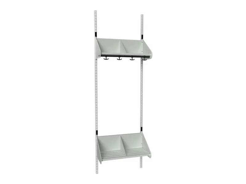 BST kombination E. Garderobe påbygningssektion med 3 pladser. Hatte- og skohylde med skillevægge i pulverlakeret mørkegrå metal, RAL 7012. 1 stk. vægskinne og garderobestang med 9 ankerkroge. Pladsbredde 300 mm og totalbredde 914 mm.