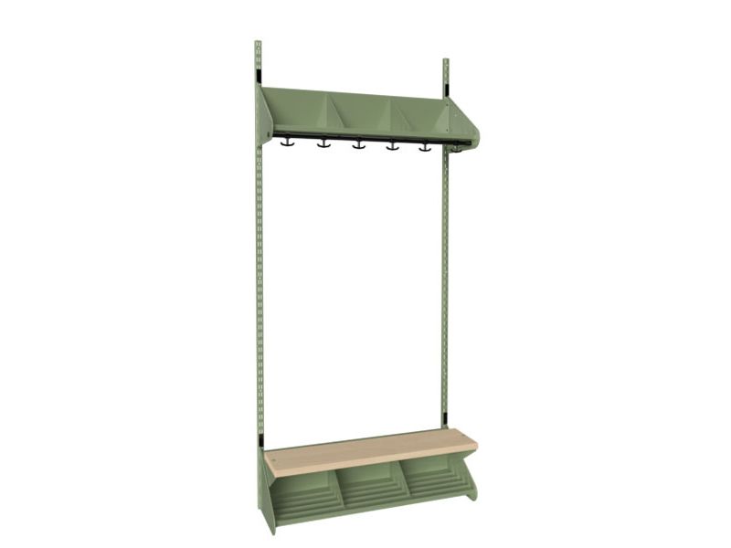 BST kombination G. Garderobe startsektion med 3 pladser og siddebænk. Hatte- og skohylde med skillevægge i pulverlakeret grøn metal, RAL 6021. 2 stk. vægskinne og garderobestang med 9 ankerkroge. Pladsbredde 300 mm og totalbredde 914 mm. Siddebænk med sæde i birk højtrykslaminat.