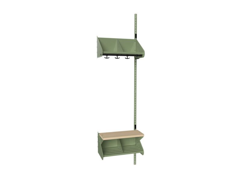 BST kombination G. Garderobe påbygningssektion med 2 pladser og siddebænk. Hatte- og skohylde med skillevægge i pulverlakeret grøn metal, RAL 6021. 1 stk. vægskinne og garderobestang med 6 ankerkroge. Pladsbredde 250 mm og totalbredde 515 mm. Siddebænk med sæde i birk højtrykslaminat.