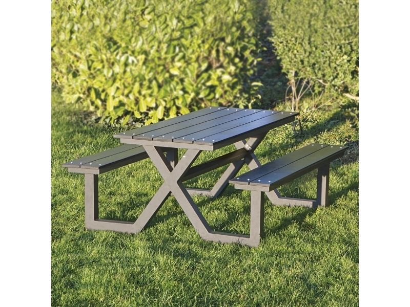 Bord-/bænkesættet X-model til børn har et robust udtryk med kraftige X-formede aluminiumsben. Her er tænkt over funktionaliteten, da X-benene giver god plads til benene, så den er let at sætte sig ved og let at komme fra. Derudover passer sættet godt til den travle familie eller institution, der ikke vil bruge megen tid på vedligeholdelse. Sættet er nemlig fremstillet i vedligeholdelsesfri, sort nonwood og aluminiumsstel. Sættet kan stå ude året rundt og rengøres blot med vand og sæbe.