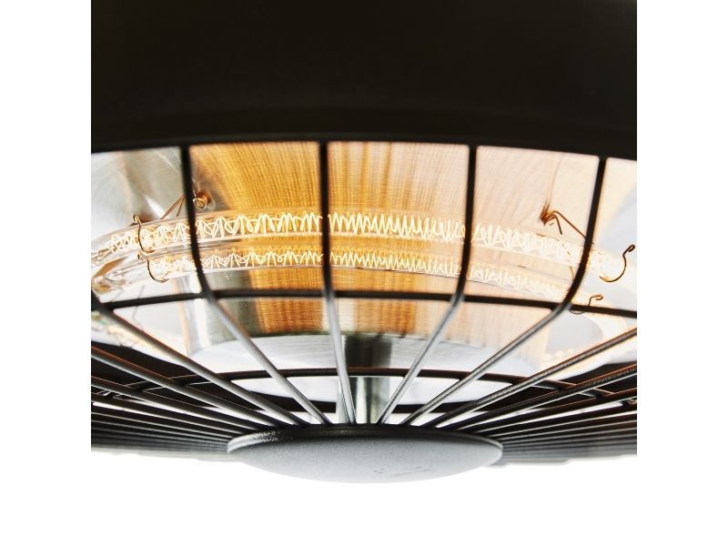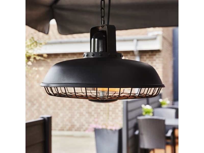 Lofthængt, infrarød terrassevarmer i et råt, industrielt look. Ideel til montering over bordet på den overdækkede terrasse, i forteltet eller i udestuen. 80% af energien i denne HORTUS terrassevarmer konverteres til varme og giver rigelig varme til de personer, der sidder omkring bordet. 1800W klar, infrarød halogenrør med en levetid på minimum 5000 timer. 3 effektrin på henholdsvis 600, 1200 og 1800W, som kan betjenes fra den medfølgende fjernbetjening. Soft touch tænd/sluk knap. Et overtræk (art. 211-346) kan købes som ekstra tilbehør.