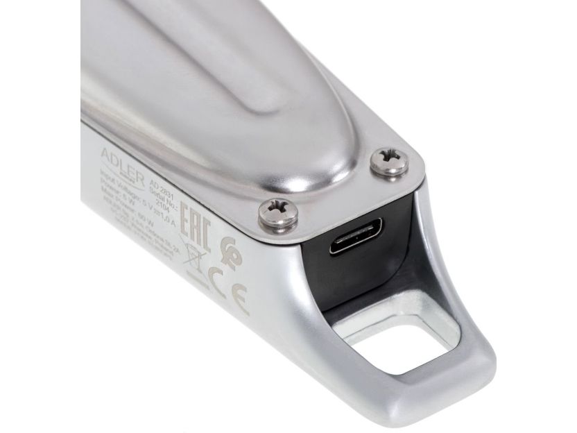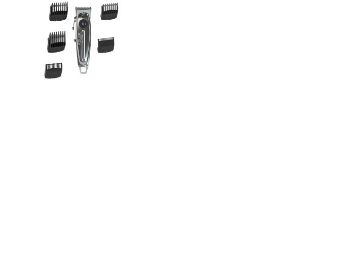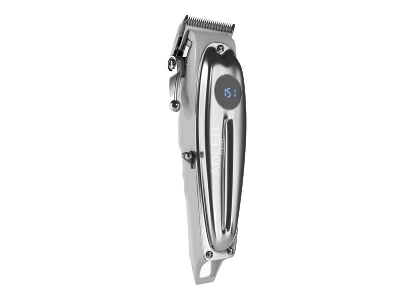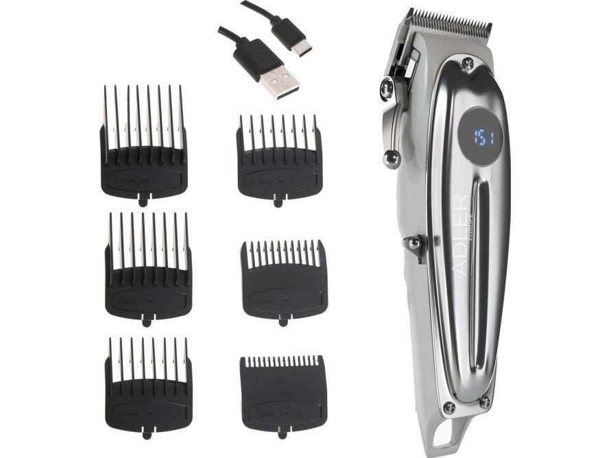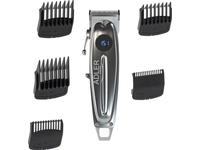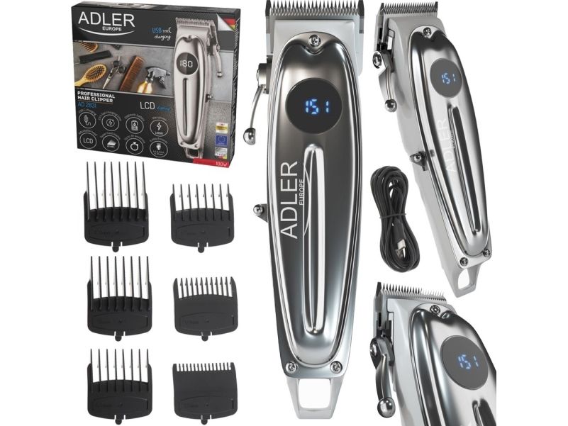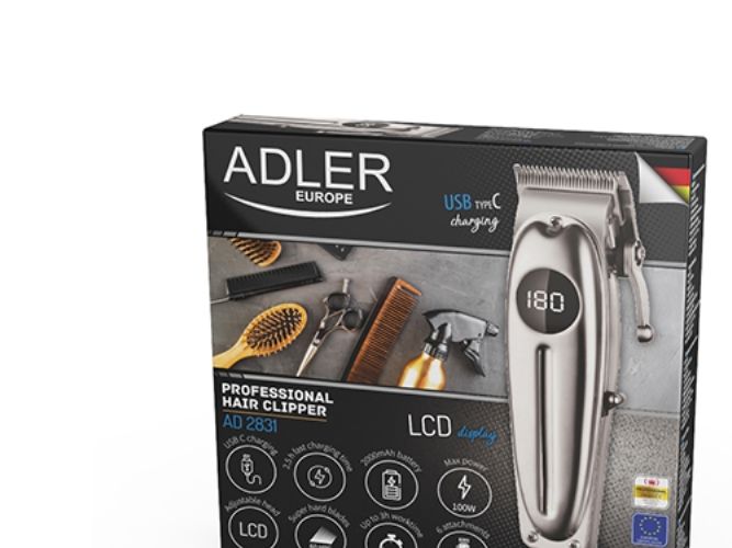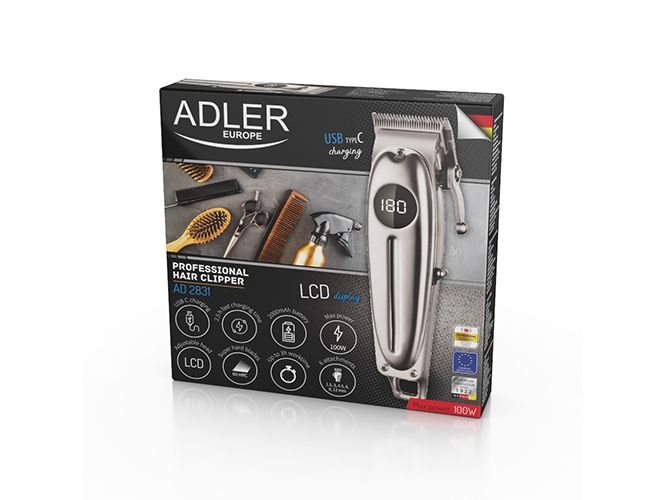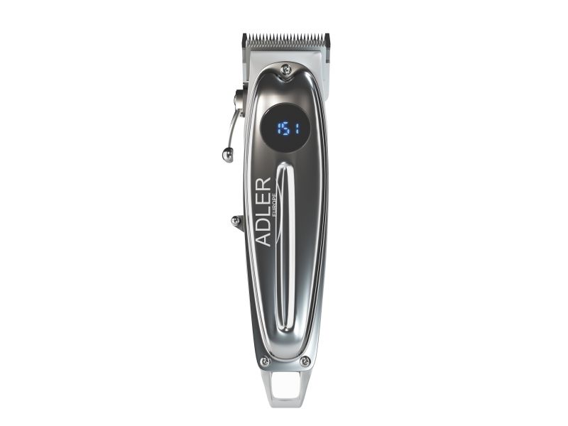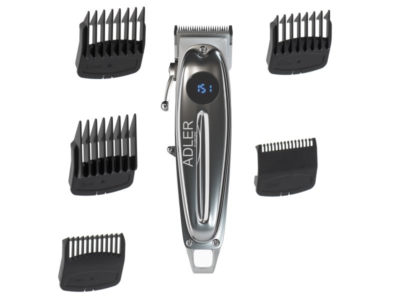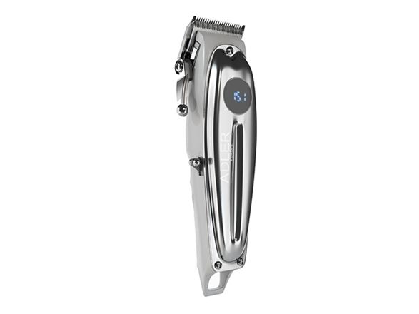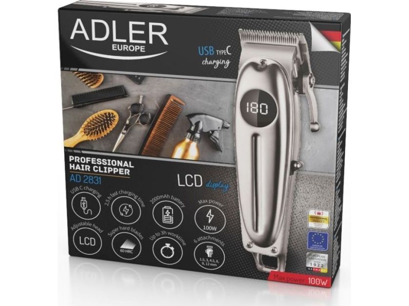 The Adler 2831 hair clipper offers a professional and precise haircut with a ceramic blade. A powerful battery allows you to use the razor for up to several hours, but you can always use the cord if you want. The machine is equipped with 6 different attachments: 1.5, 3, 4.5 6, 9, 12, mm and an adjustable head with a cutting length of 1.0-1.8 mm. The LCD display shows the battery charge percentage.Adler AD 2831. Product colour: Silver, Stainless steel, Shape: V-shaped, Minimum hair length: 1 mm. Display type: LCD. LED indicators: Battery level. Power source: AC/Battery, Operating time: 180 min, Battery type: Built-in battery. Cord length: 2 m, Weight: 410 g