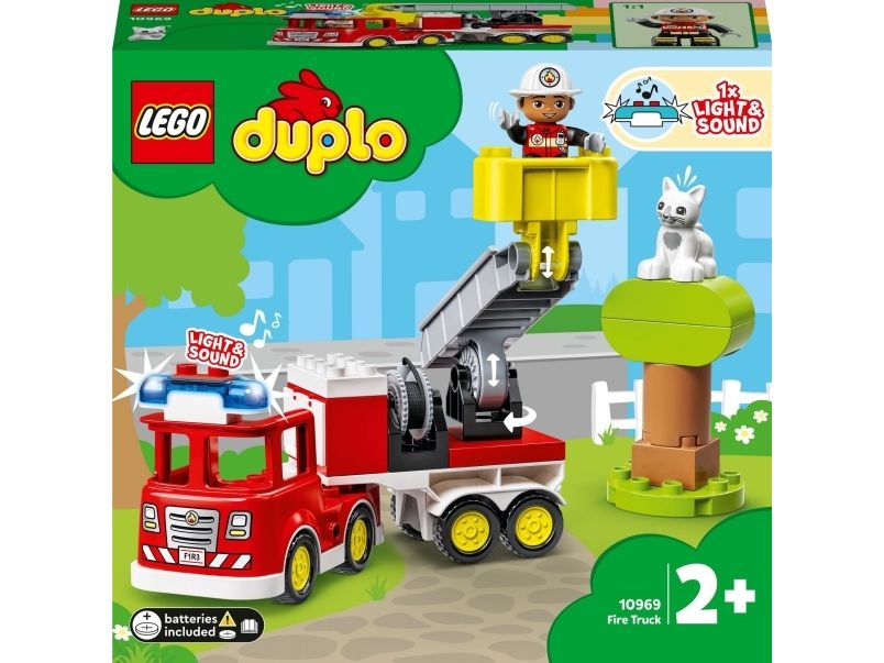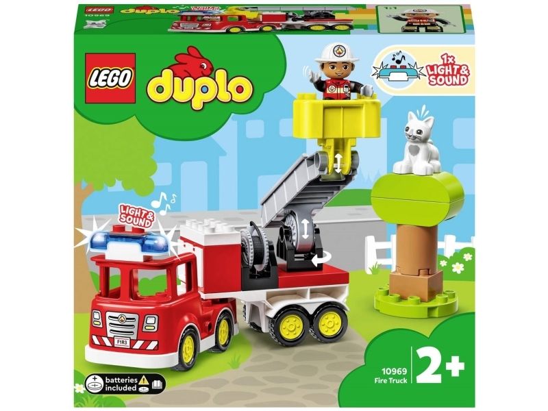 2. Autentiske detaljer – settet inneholder en brannkonstabel og en LEGO® DUPLO® figur av en katt samt et byggbart tre og en brannbil med flere funksjoner, blinkende lys og sirene (batterier følger med)