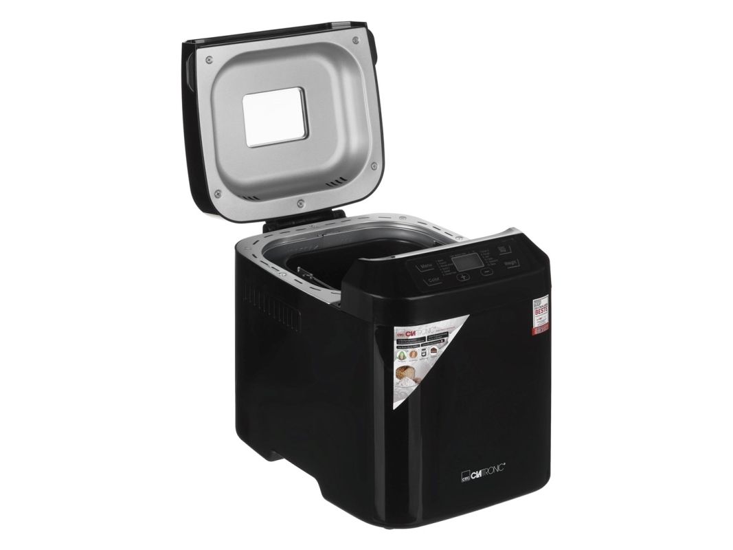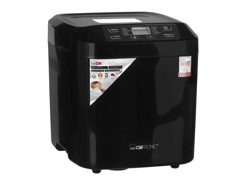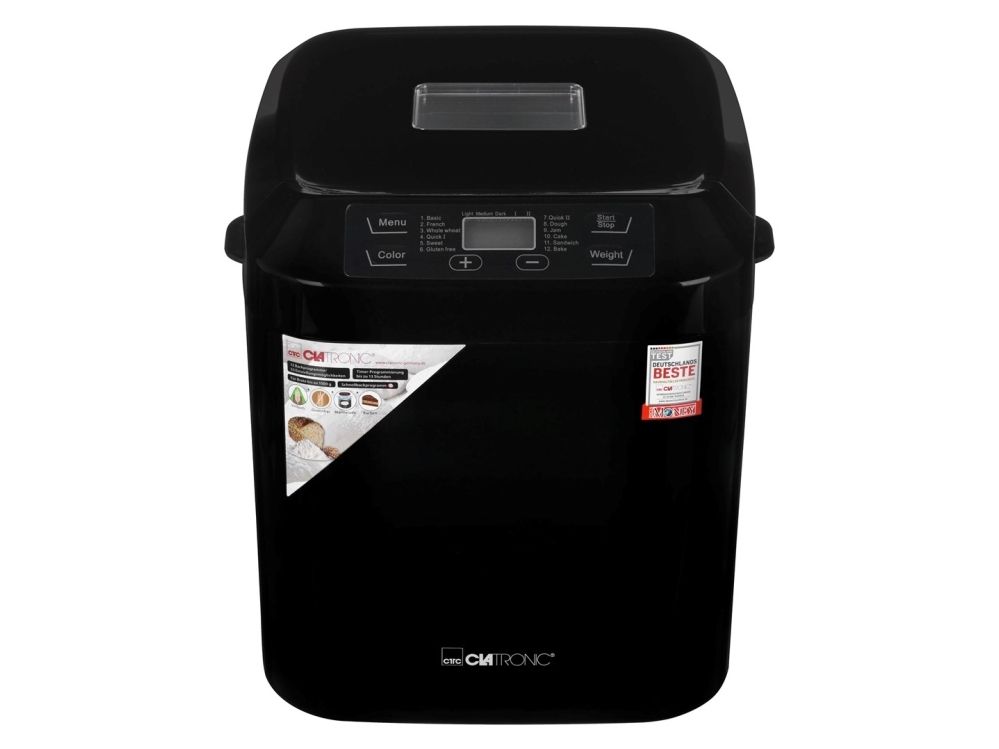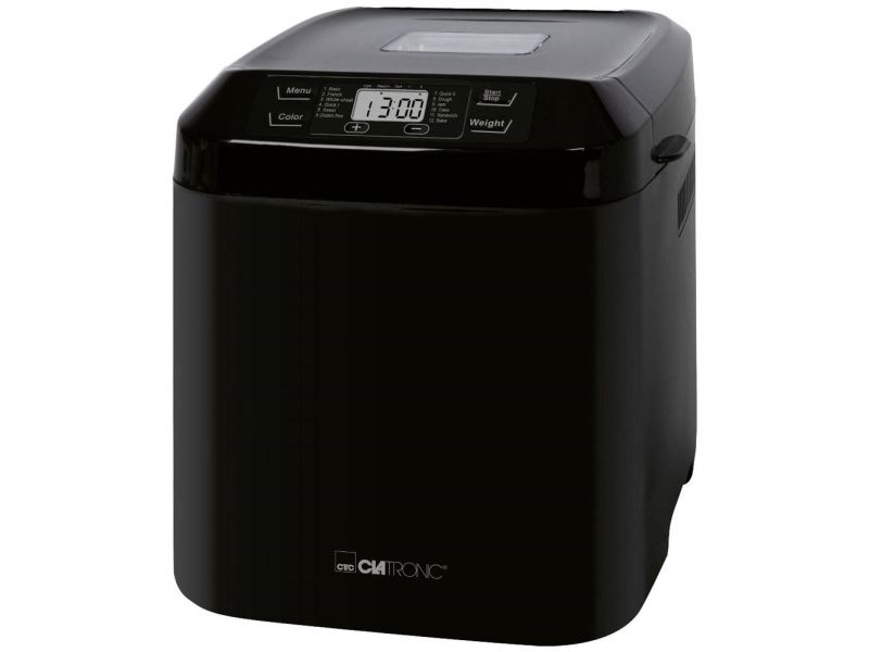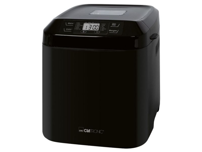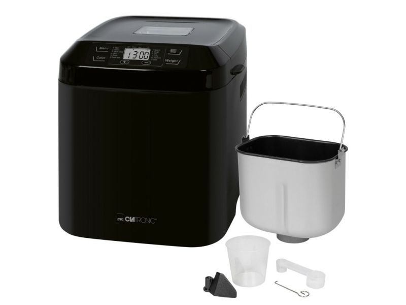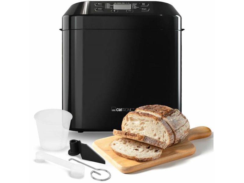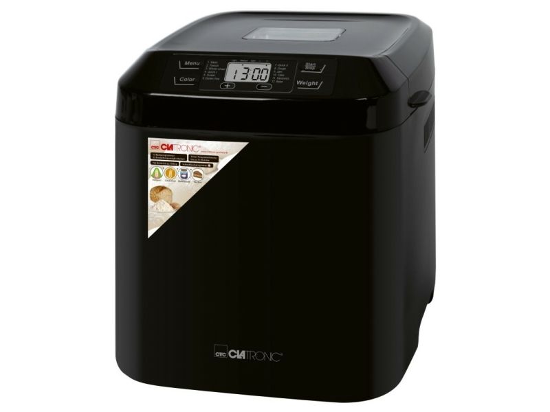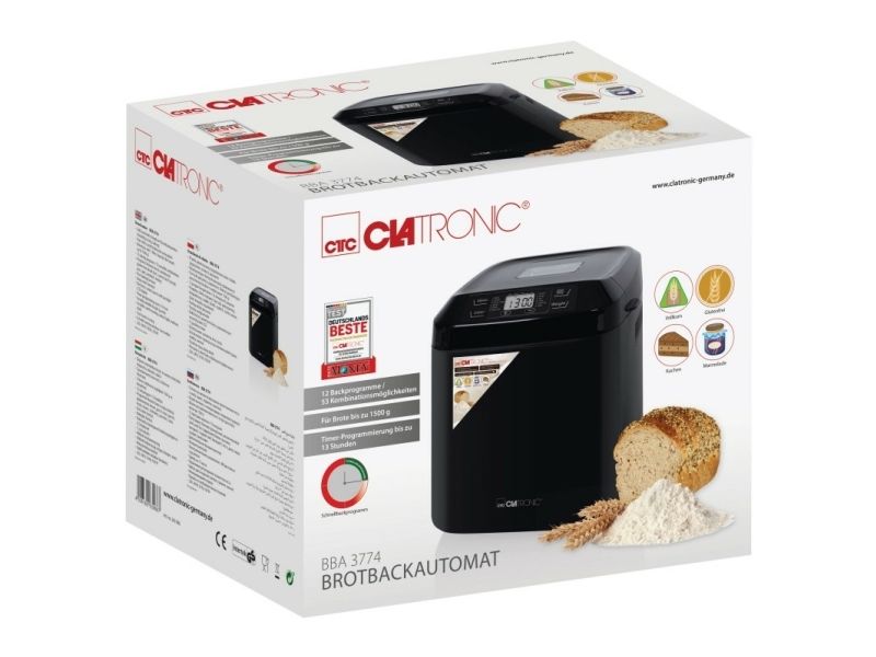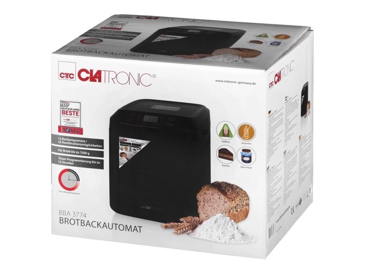 The dough amount and crust browning can be adjusted as needed. With a cool touch housing and a removable lid with a viewing window, the device is easy to use and clean.Clatronic BBA 3774. Product colour: Black, Maximum bread weight: 1.5 kg, Bread & dough making programs: Dough, Gluten free bread, Sweet bread, White bread, Whole-grain bread. Power: 550 W, AC input voltage: 220 - 240 V, AC input frequency: 50 Hz. Width: 280 mm, Depth: 330 mm, Height: 300 mm