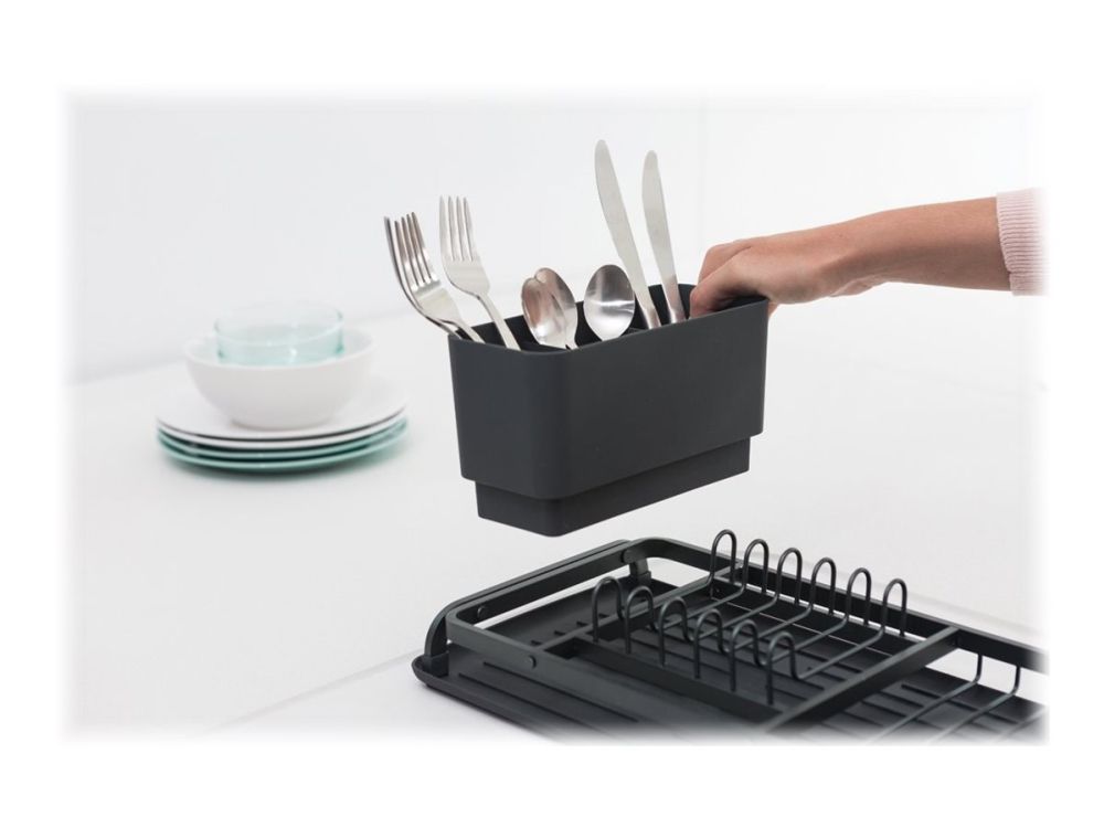 The Brabantia drying rack is a practical solution for drying dishes and cutlery with ease. With its compact size of 20 x 46.3 cm, it fits conveniently on kitchen counters or tables without taking up too much space, making it ideal for small kitchens or limited areas. The package includes a drip tray that catches excess water and a removable cutlery basket for organized drying of utensils, ensuring a tidy workspace. Standing at a height of 12.6 cm for single items, this drying rack offers an effective method to air dry dishes quickly and efficiently.