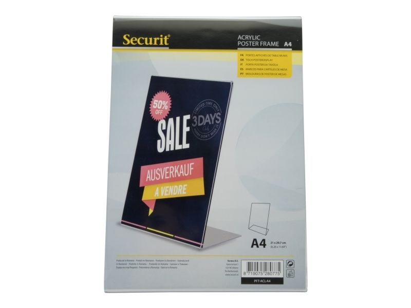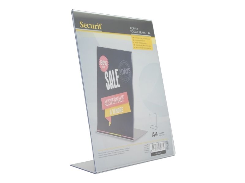 • Præsenter dine tilbud, menuer, rabatter eller meddelelser med vores Securit® L-formede A4 akryl plakatramme. Denne prisvenlige gennemsigtige plakatramme bruges meget i barer, caféer, restauranter, detailhandel og kontorer. Den er fritstående, L-formet, dobbeltsidet og har en overflade, der er let at rengøre. Udskift plakater med lethed, når du vil. Fås i forskellige størrelser og former.