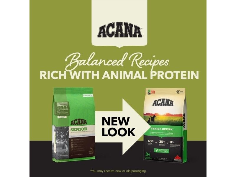 ACANA Senior indeholder store mængder protein fra vores rigt nærende frilands kylling, hele redelagte æg, og vildtfanget flynder, der alle leveres friske fra vores region, fyldt med smag og næring.
