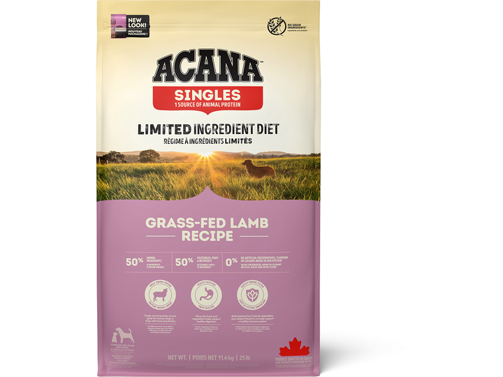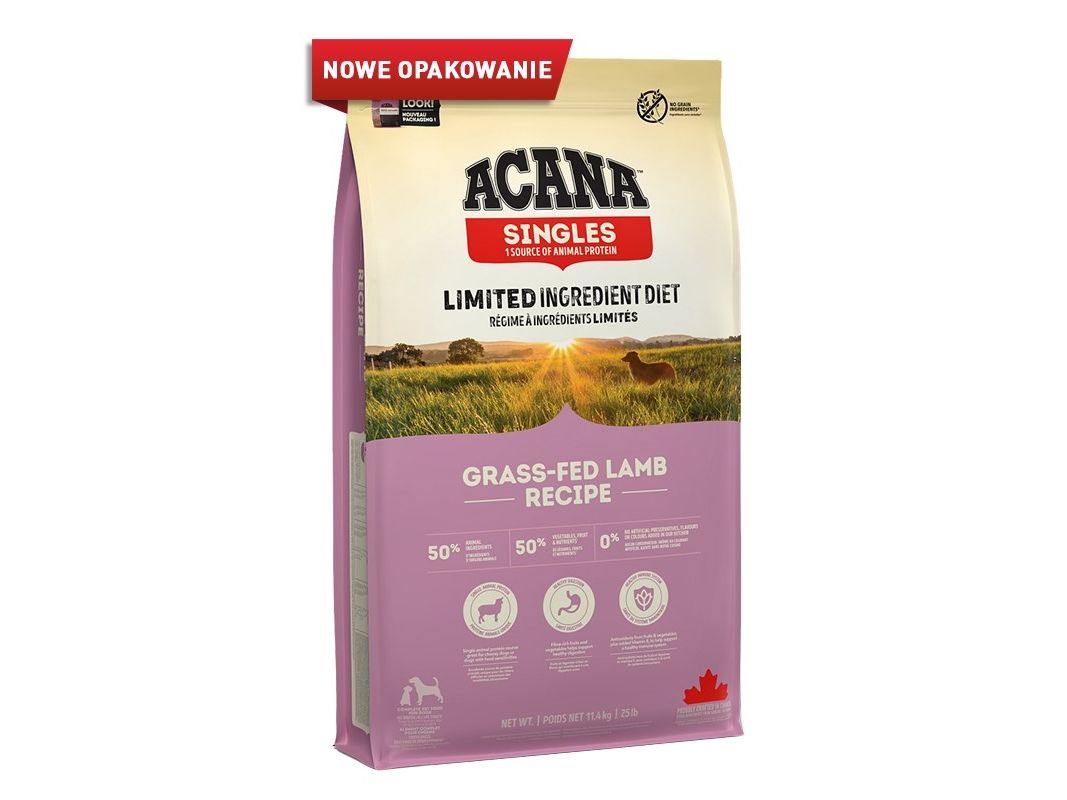 GRASS-FED LAMB TIL ALLE RACER OG LIVSSTADIER ACANA Grass-Fed Lamb er begrænset-ingrediens mad, der indeholder 50% lam, som eneste let-fordøjelige animalske protein, hvilket gør den perfekt til kost-følsomme hunde af alle racer og alle livsstadier.