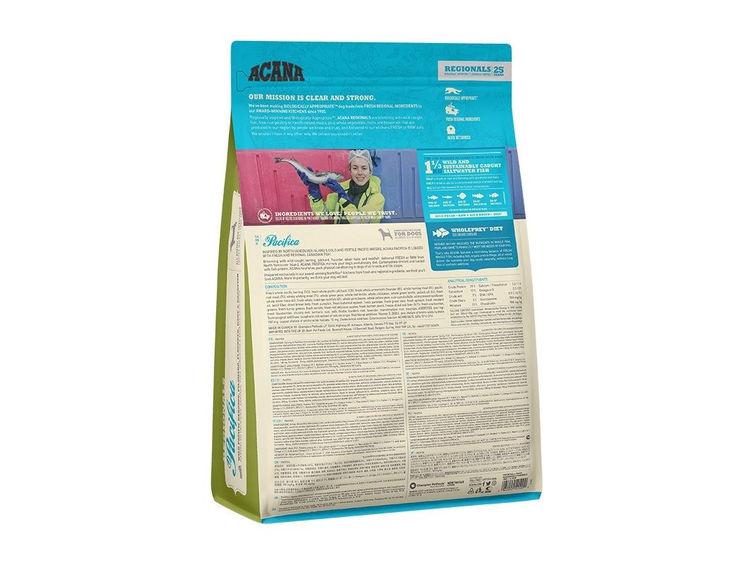 ACANA Pacifica afspejler det rige maritime dyreliv der findes i Canadas kolde klare Stillehav. Pacifica er fyldt med friske regionale Canadiske fisk, der fanges vildt og bæredygtigt ved North Vancouver Island.