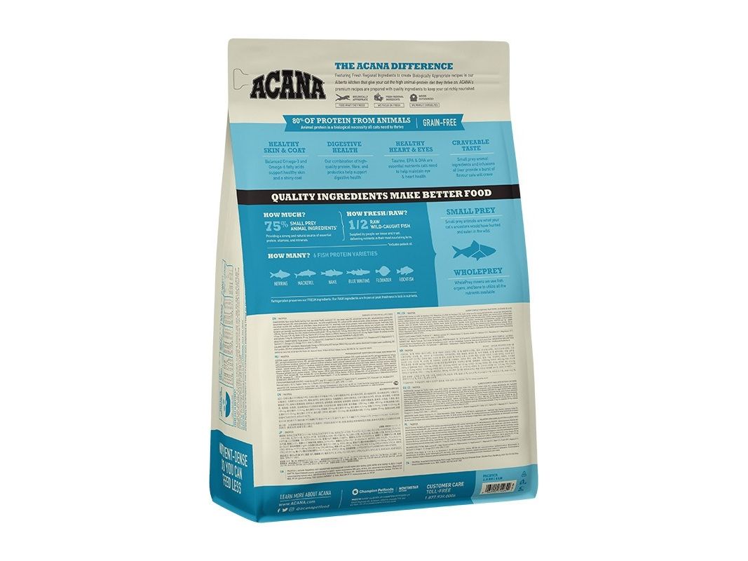 ACANA Pacifica er fyldt med Stillehavs-sild, sardin, flynder, kulmule og rødfisk, der alle leveres FRISKE og HELE hver dag. Pacifica sikrer din kat naturlig næring, uden en lang liste af tilsætninger.