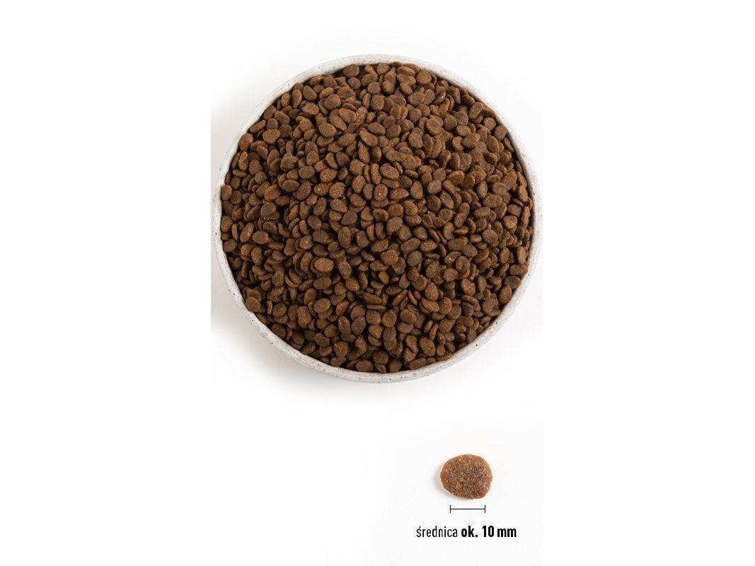 Friske hele stillehavs-sild (16%), friske hele stillehavssardiner (13%), frisk stillehavs-hellefisk (8%), Dehydreret hel sild (8%), dehydreret stillehavs-torsk (8%), dehydreret hel hvilling (8%), hele grønne ærter, hele røde linser, hele kikærter, hele grønne linser, lyssejolie (6%), frisk hel kulmule (4%), frisk hel guløjet rødfisk (4%), hele havebønner, hele gule ærter, koldpresset solsikkeolie, soltørret alfalfa, tørret brun tang, frisk hel græskar, frisk hel melongræskar, frisk hel pastinak, frisk grøn kål, frisk spinat, frisk sareptasennep, frisk majroe, friske hele gulerødder, friske Red Delicious æbler, friske Bartlett pærer, frysetørret torskelever (0,1%), friske tranebær, friske blåbær, cikorierod, gurkemejerod, mælkebøtte, glat burre, lavendel, lægestokrose, hyben.Tilsætninger: Vitamin E, K, Cholin, Zink, Kobber.Naturligt konserveret med E Vitamin.