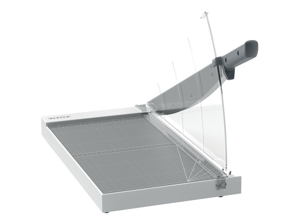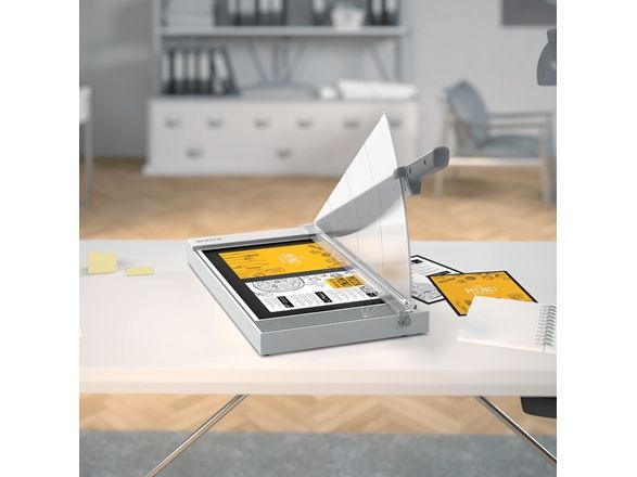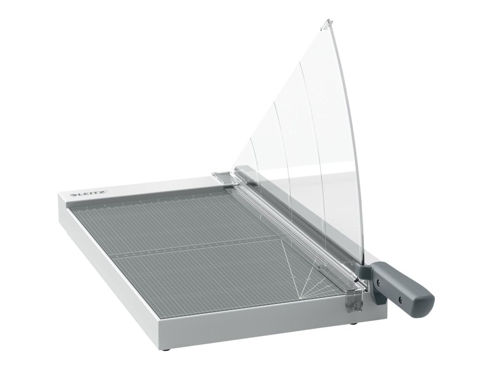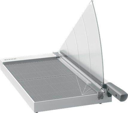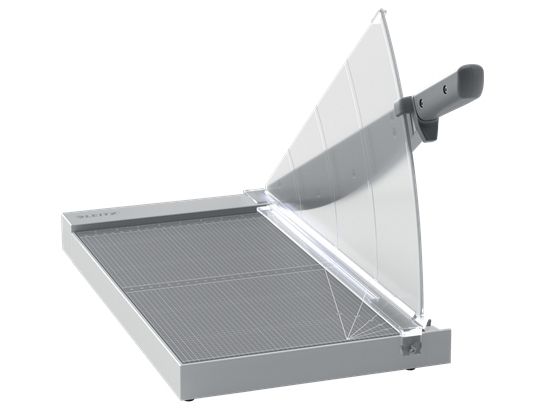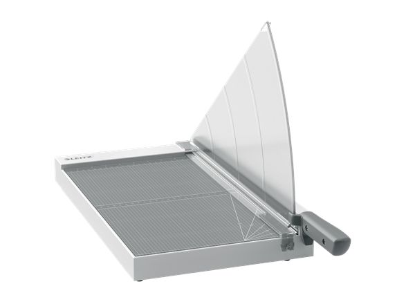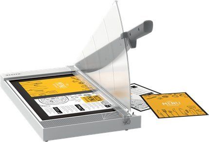 The Leitz Precision Home Office A3 Paper Cutter is perfect for home and office use to cut through paper, labels, film, photos, laminates and card. This strong and lightweight home paper cutter will effortlessly cut up to 10 sheets of A3 paper with speed and precision. Features unique EdgeGlow light technology which illuminates the cutting edge for greater visibility and maximum precision. The clear, manual paper clamp keeps the paper secure, while the ergonomic handle ensures comfortable and easy cutting. It is quick and easy to align the paper with the simple metric grid lines, angle guides and measuring rules on the smooth, laminated work surface. The secure blade safety guard gives total protection and the safety latch keeps the blade locked closed while not in use. With a high quality stainless steel blade, sturdy work surface, you have peace of mind that this guillotine paper cutter will provide accurate cutting for many years.