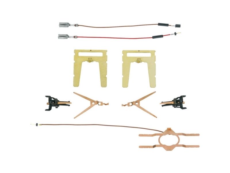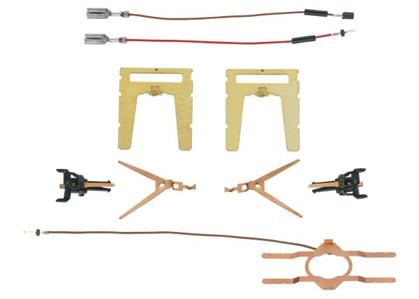 Contents: 2 close coupler heads for standard coupler pockets with contacts, 2 sets of contacts for coupler drawbars, 1 ground spring for the truck, 2 connecting wires, and installation instructions.