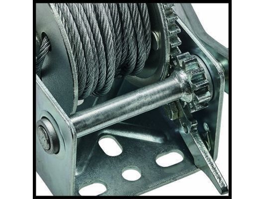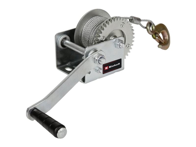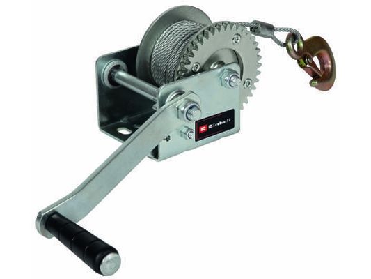 The Einhell TC-WI 500 hand winch can handle a maximum payload of 500 kilograms. The hand winch from Einhell has a 10 meter twist-free wire cable (Ø 4.2 mm) with a load hook and a retention latch. The retention latch prevents the load from being unhooked accidentally. Thanks to a return stop the cable and the load can be stopped securely. The hand crank has a soft grip for a firm, secure hold and a comfortable working. There is a mounting plate with holes for quick and easy fixation.